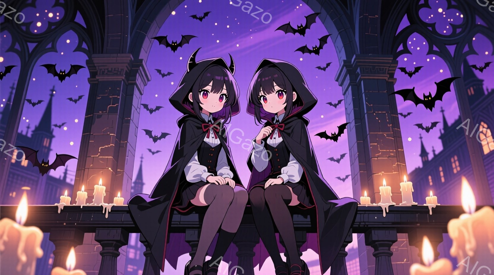 黒い衣装と翼、そして頭に小さな角を持つ、同じように見える二人の少女が描かれています。彼女たちは石造りの欄干に腰掛け、微笑んでおり、周囲にはたくさんのろうそくが灯っています。背景には、ゴシック様式の建物と夜空に舞うコウモリがあり、ハロウィーンのような神秘的で楽しい雰囲気を醸し出しています。
