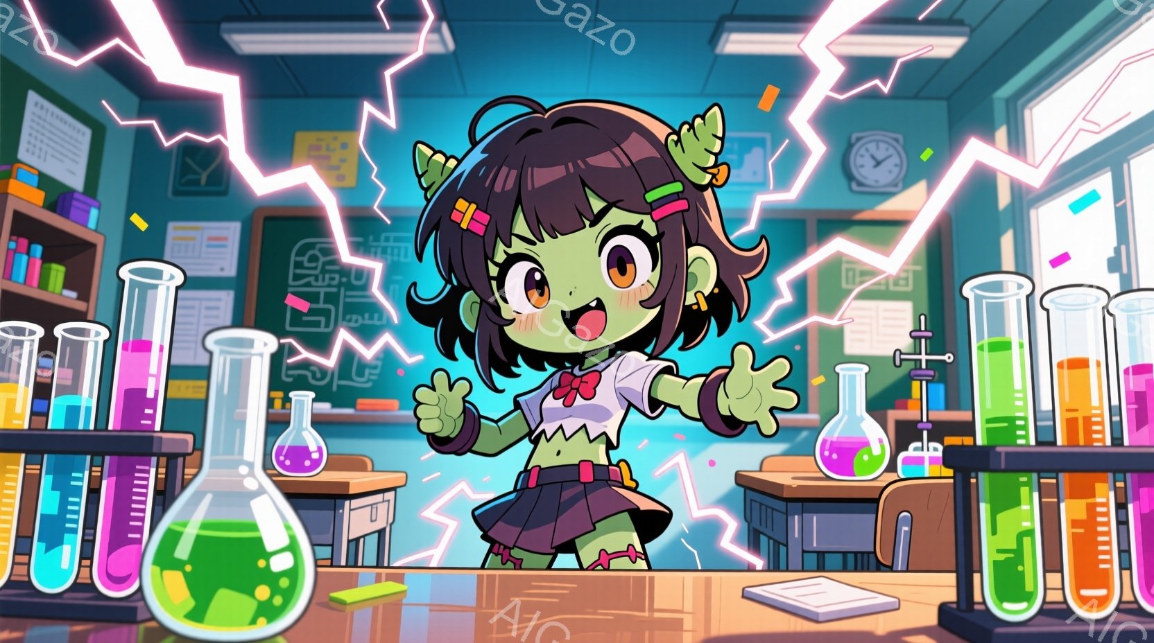 科学実験室を舞台に、緑色の肌と紫色の髪をした、フランケンシュタイン風の女の子が描かれています。彼女は明るいピンクのワンピースを着ており、満面の笑みを浮かべ、片手を握り締めて活気に満ちたポーズをとっています。背景には試験管やビーカーが並び、雷が光る様子が描かれており、全体的にエネルギッシュでコミカルな雰囲気を醸し出しています。