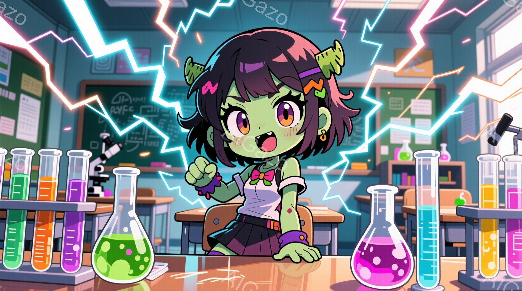 少女は科学実験室で、フリル付きの白いブラウス、黒いミニスカート、赤いリボンをつけた茶色の髪で、興奮した表情で両手を上げています。背景には試験管や顕微鏡が並び、青と緑の電気のような光が彼女の周りを駆け巡り、活気に満ちた実験室の様子が描かれています。全体的に、活発でエネルギッシュな雰囲気が漂い、科学への好奇心と楽しさを表現しています。