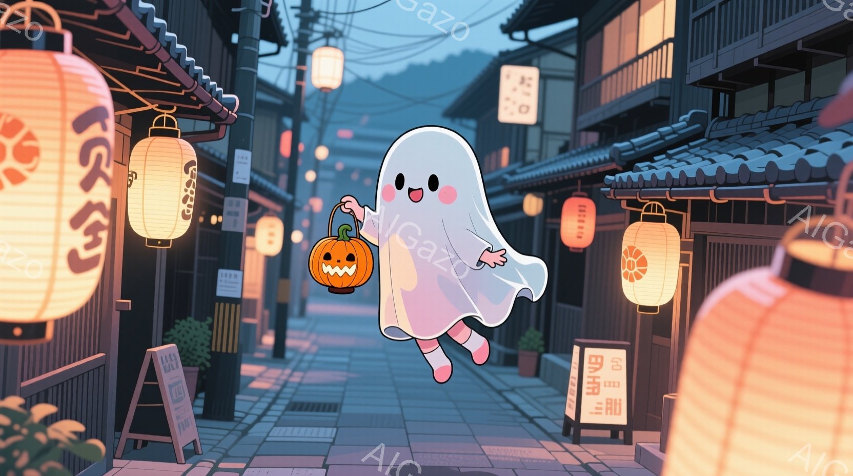 白い幽霊が日本の古い街並みを漂っている様子が描かれています。幽霊は可愛らしい表情で、片手にオレンジ色のジャック・オー・ランタンを持って楽しそうに飛んでいます。背景には、伝統的な木造建築が並び、提灯が灯り、少し霧がかかったような穏やかな夜の雰囲気を醸し出しています。