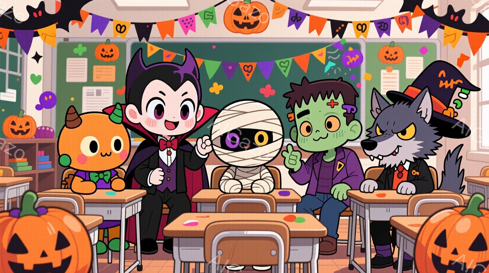 ハロウィーンの衣装を着たキャラクターたちが教室に集まっています。吸血鬼、魔女、ミイラ、フランケンシュタイン、狼男がそれぞれカボチャを持って座っており、楽しそうな表情をしています。教室はハロウィーンの飾り付けで賑わっており、壁にはカボチャやコウモリが飾られ、全体的に明るく楽しい雰囲気です。