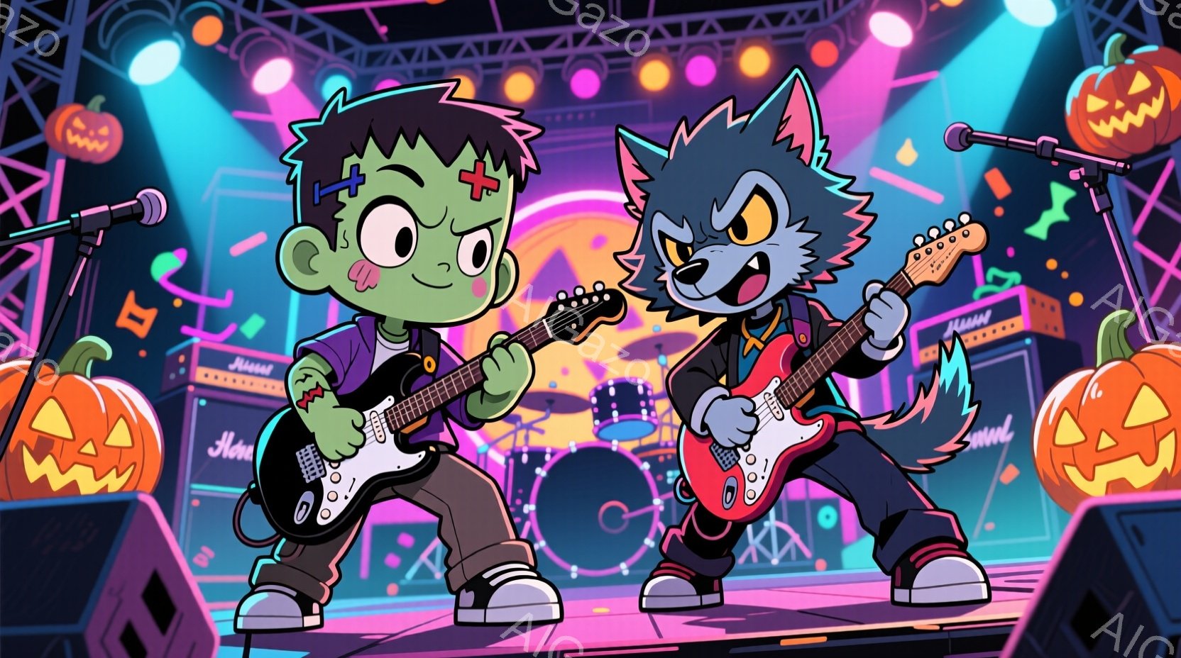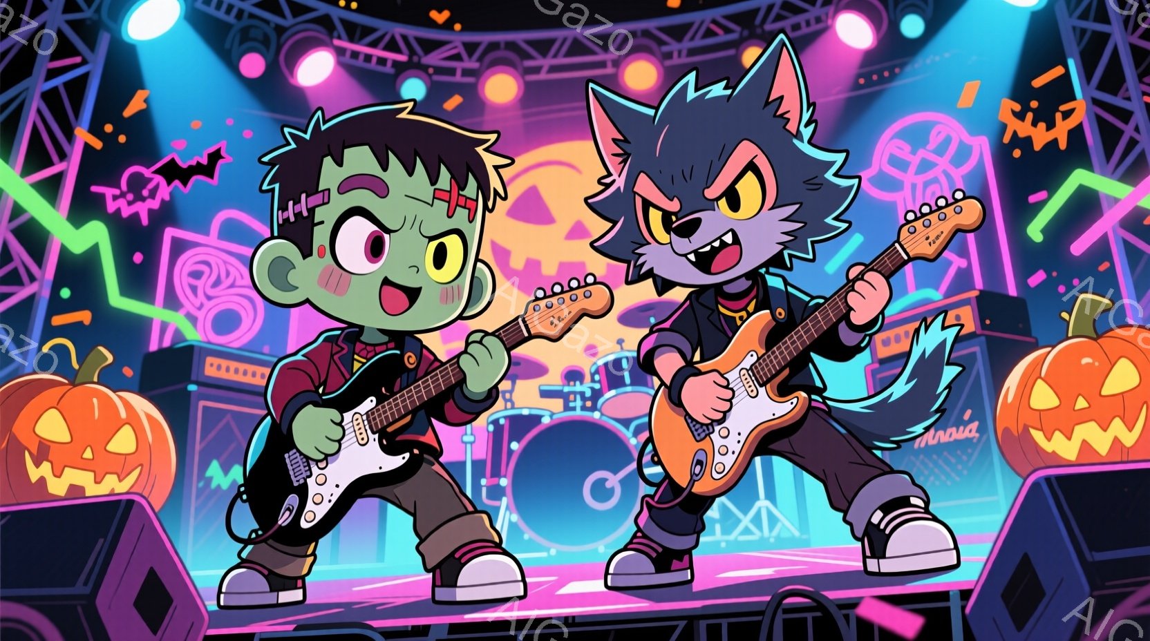 フランケンシュタイン風の少年と狼男風の少年が、ステージ上でギターを演奏しています。二人は黒い服装で、熱狂的な表情で演奏に集中しており、背後にはハロウィーンの装飾や楽器が配置されています。背景は紫とピンクのライトアップされたステージで、ハロウィーンのパーティーのような賑やかな雰囲気が漂っています。