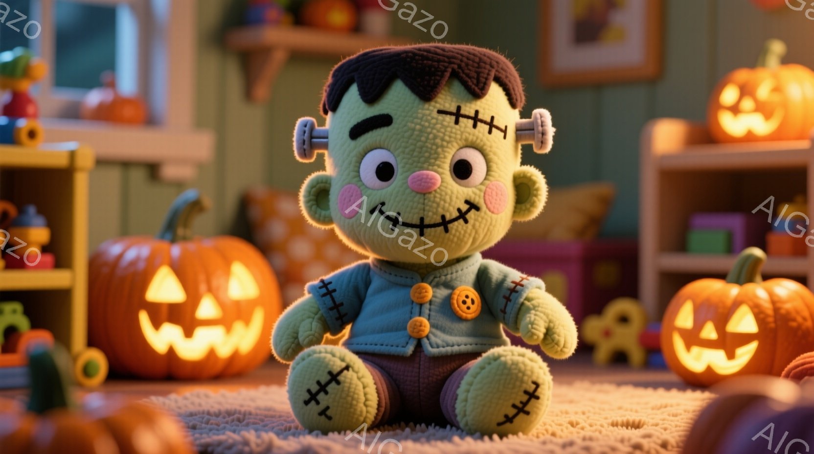 明るい背景に、緑色のフランケンシュタインのぬいぐるみのおもちゃが座っています。紫色のジャケットを着ており、首のボルトと縫い目、そして親しみやすい笑顔が特徴です。背景には、様々な大きさのジャック・オー・ランタンが並び、おもちゃのブロックやカラフルな積み木が散りばめられた遊び心のある空間が広がっています。