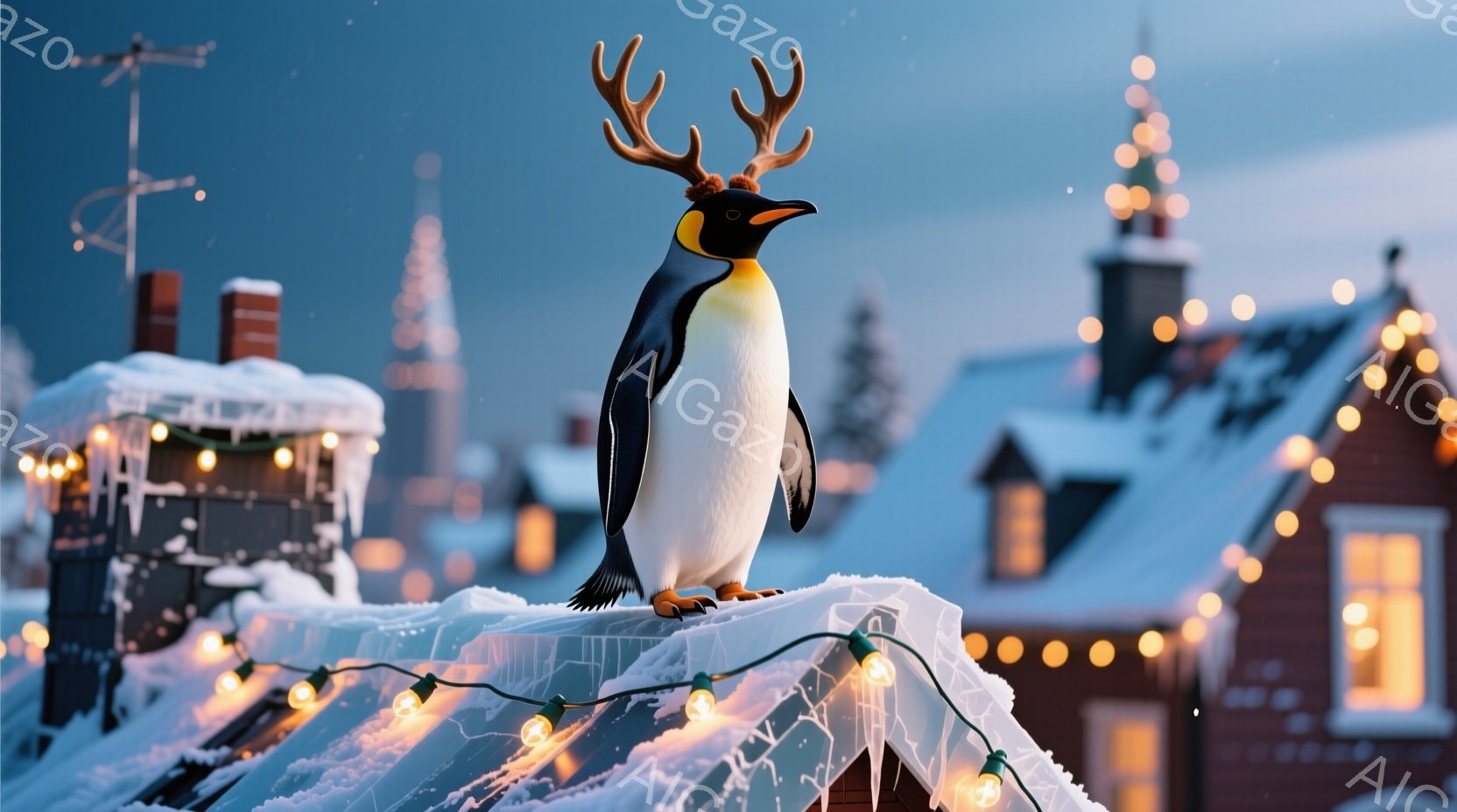 白黒のペンギンが、雪で覆われた屋根の上にとまっています。頭には角が生えており、まるで鹿のようなユニークな姿です。背景にはレンガ造りの建物や街灯が見え、屋根には装飾用の電飾が飾られており、冬の幻想的な雰囲気を醸し出しています。