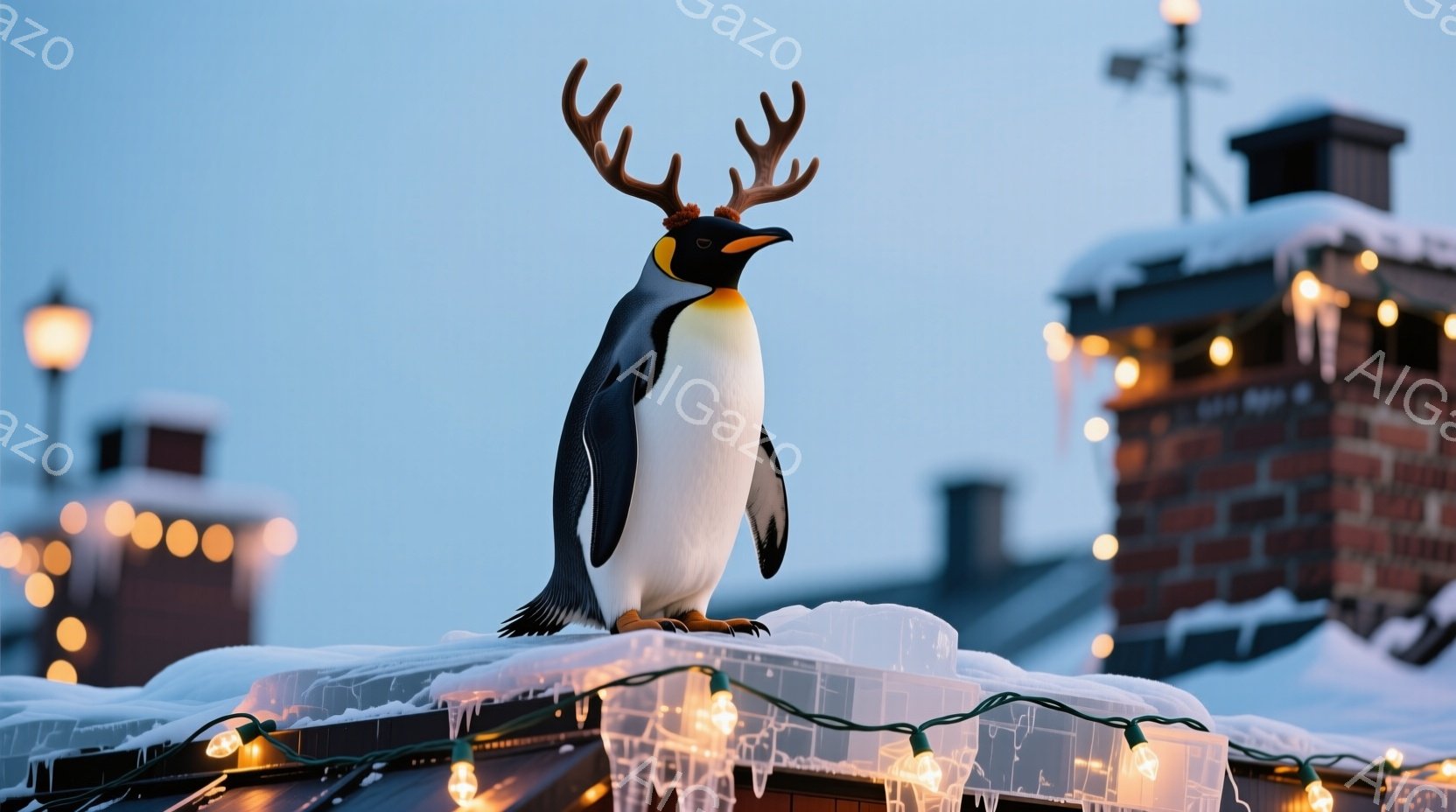 雪で覆われた屋根の上に、角を持つペンギンが立っている。背景には、夕焼け空の下、雪景色が広がる街並みと煙突が見え、クリスマスのイルミネーションが屋根を彩っている。全体的に幻想的で、冬の暖かさと遊び心を感じさせる雰囲気である。