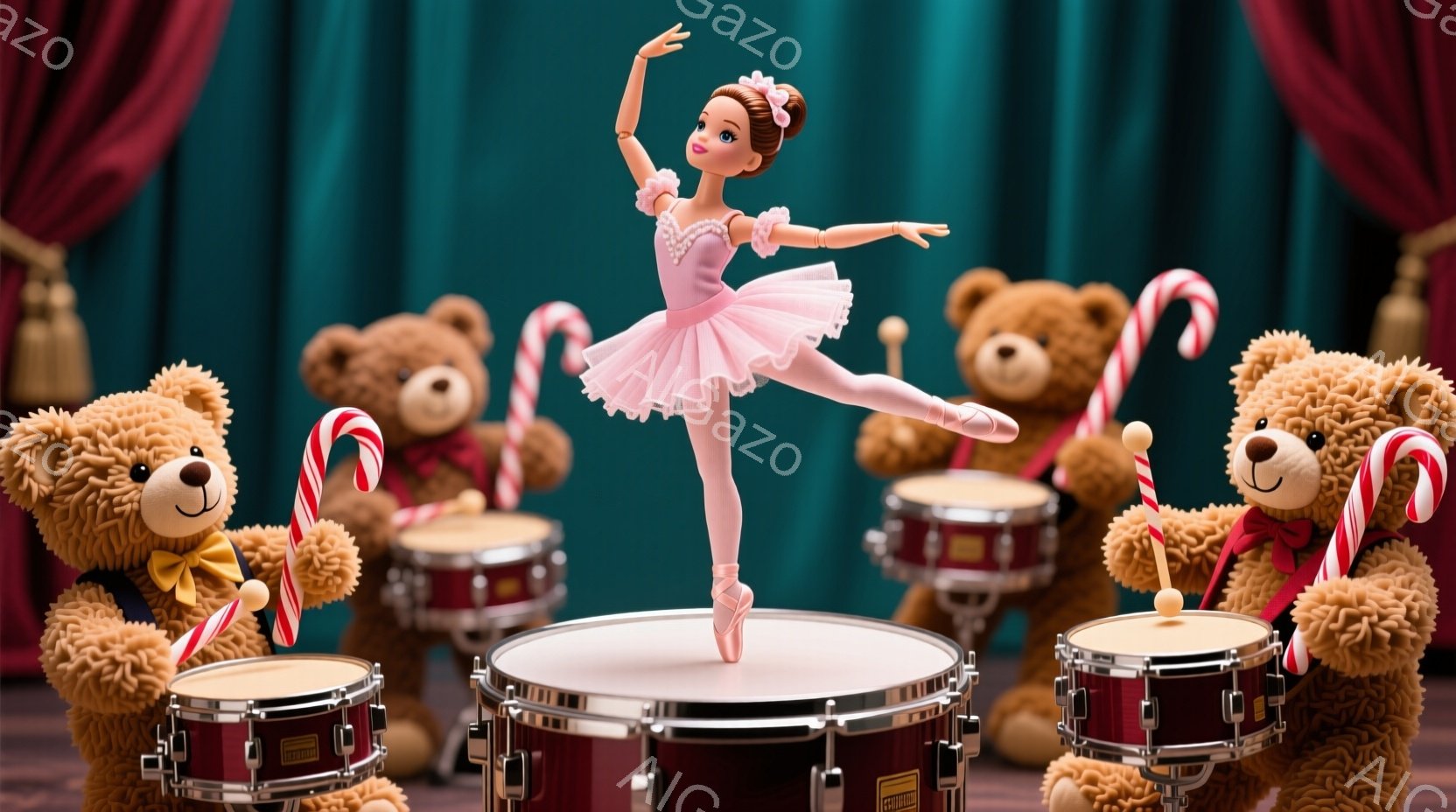 バレリーナの人形が、赤いドラムセットとテディベアに囲まれて舞台中央でポーズをとっています。ピンクのチュチュとリボン、そして髪を高く結んだスタイルで、優雅なバレエの姿勢を見せています。背景は深い緑色のカーテンで、全体的に華やかで遊び心のある雰囲気です。