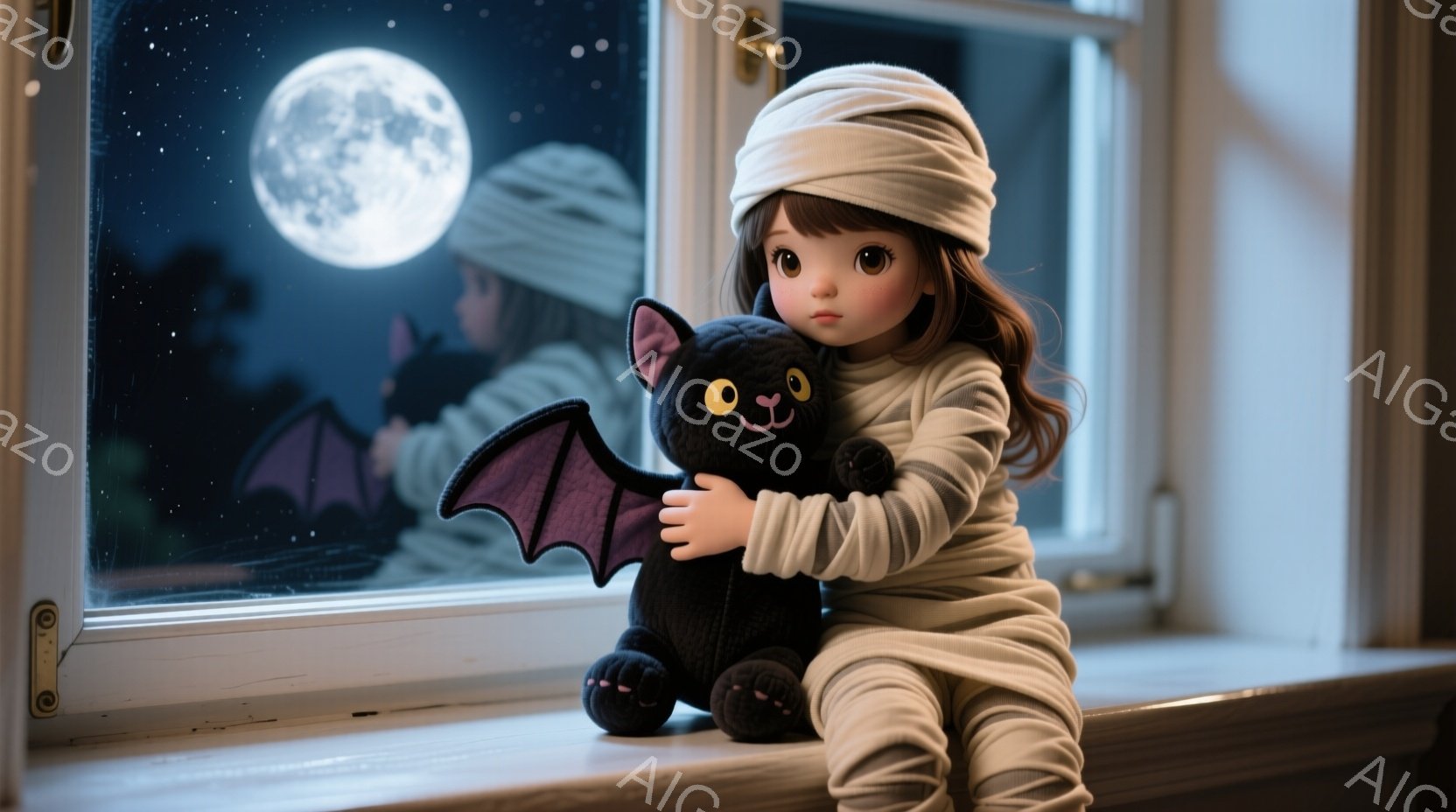 茶色の髪を少しカールさせた少女が、窓枠に座って黒いコウモリのぬいぐるみ抱きしめています。彼女は包帯のような衣装を着ており、ハロウィーンの仮装をしているようです。背景には満月が輝き、星空が広がり、夜の静かで幻想的な雰囲気を醸し出しています。