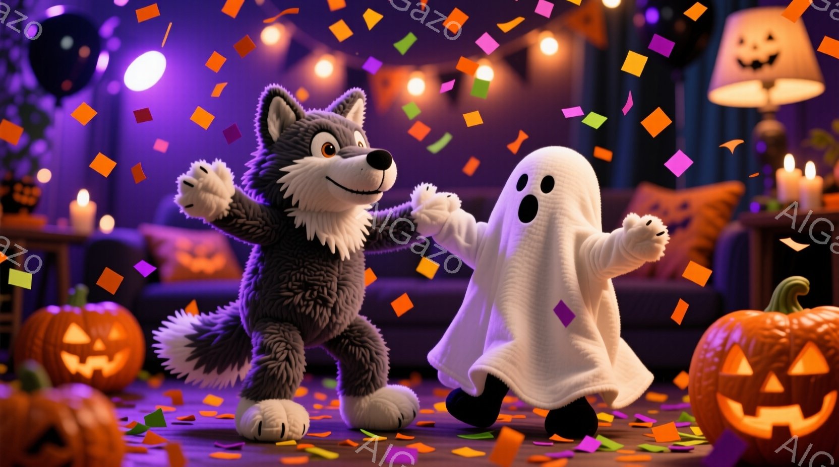 ハロウィーンをテーマにした楽しいシーンが描かれています。灰色の毛並みの狼のキャラクターと白い幽霊のキャラクターが、カラフルな紙吹雪が舞う中で楽しそうに踊っています。背景には、ジャック・オー・ランタンや風船が配置され、お祭り気分を盛り上げています。