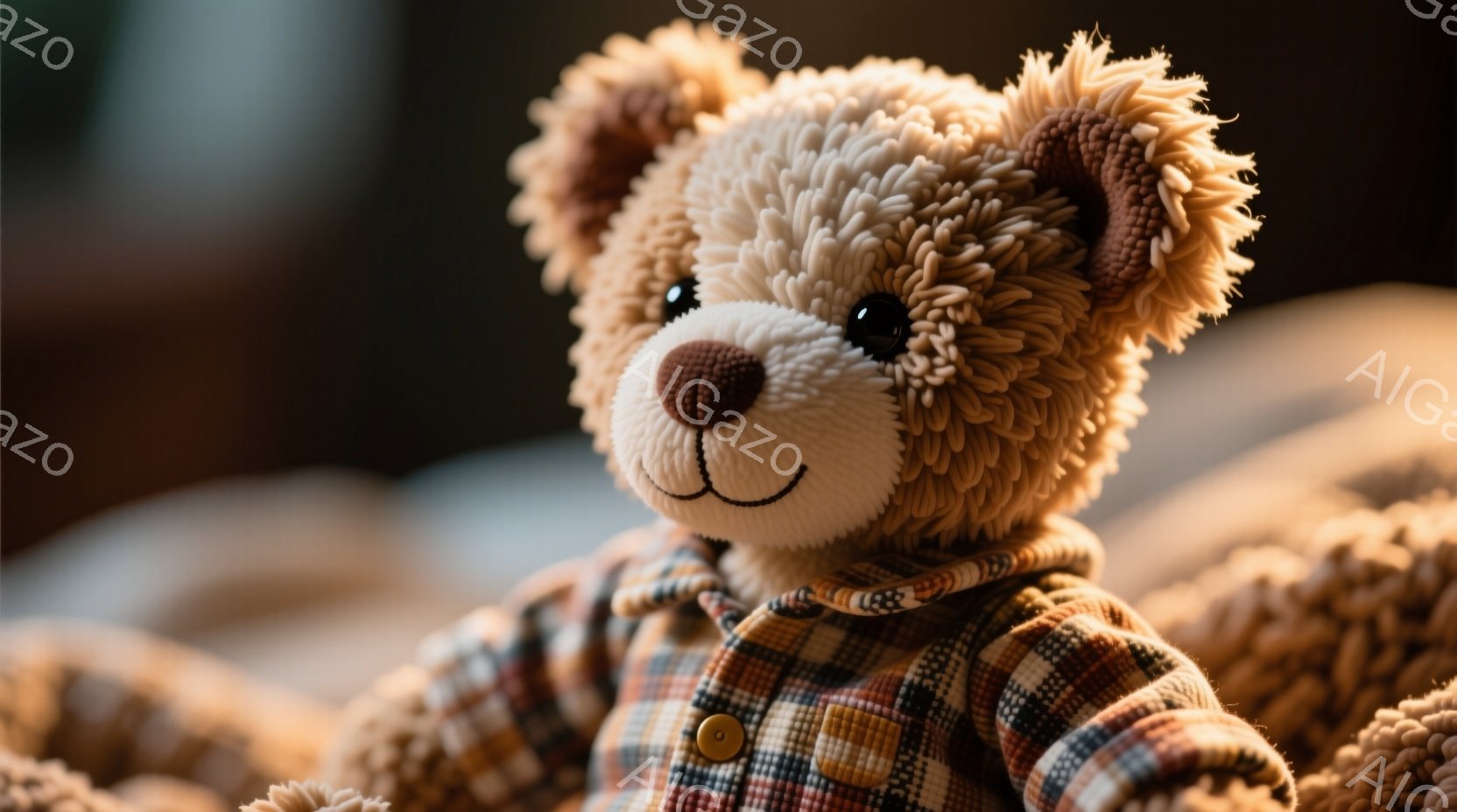 ふわふわの毛並みを持つテディベアが、緑と茶色のチェック柄のジャケットを着ています。つぶらな瞳と控えめな笑顔が愛らしい印象を与え、穏やかな雰囲気を醸し出しています。背景にはぼやけた暖色系の布地が見え、温かく心地よい空間を演出しています。