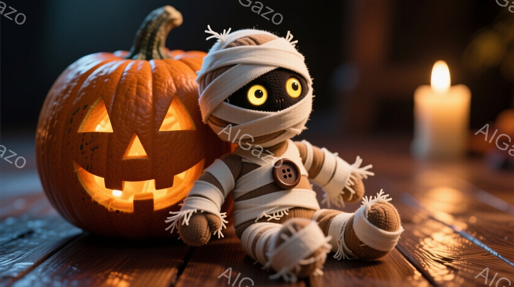 白い包帯でミイラのように巻かれた人形が、茶色の木製のテーブルの上に座っています。人形は大きなボタンの目が付いており、藁のような髪の毛が飛び出しています。背景には、彫刻が施された光るカボチャと、点灯したキャンドルがあり、ハロウィンの夜の温かく不気味な雰囲気を醸し出しています。