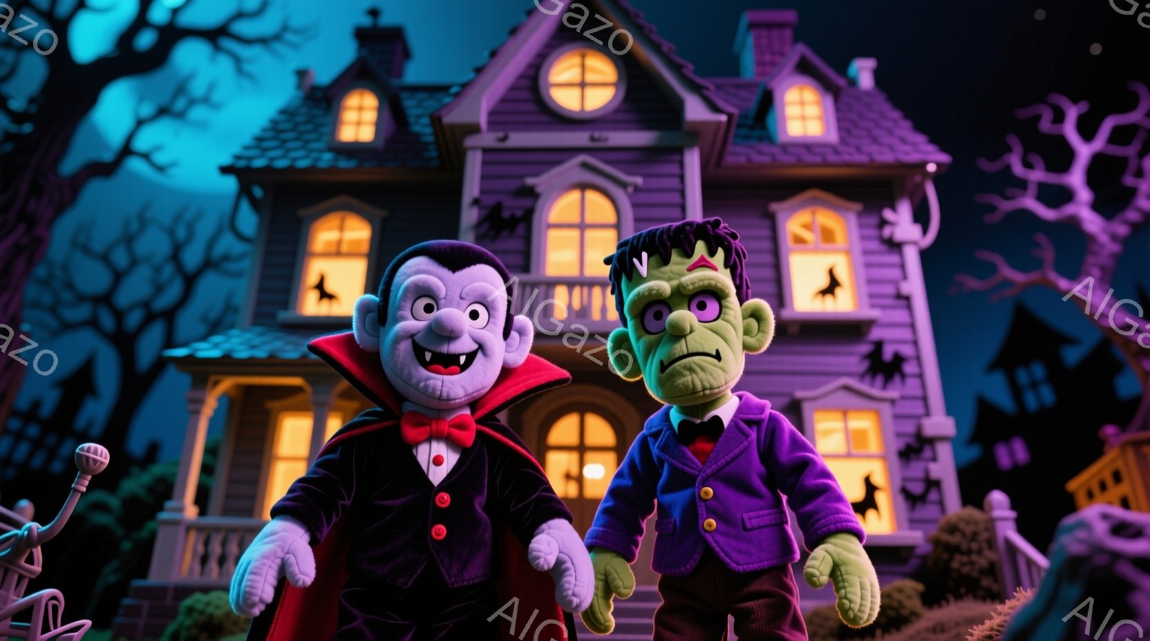 吸血鬼とフランケンシュタインのモンスターが、不気味な屋敷の前で肩を並べて立っています。吸血鬼は黒いスーツに赤いマント、整髪された髪で、自信に満ちた微笑みを浮かべています。背景には、暗い夜空とシルエットの木々、そしてハロウィーンらしいカボチャとコウモリが描かれており、全体的に不気味で楽しい雰囲気です。