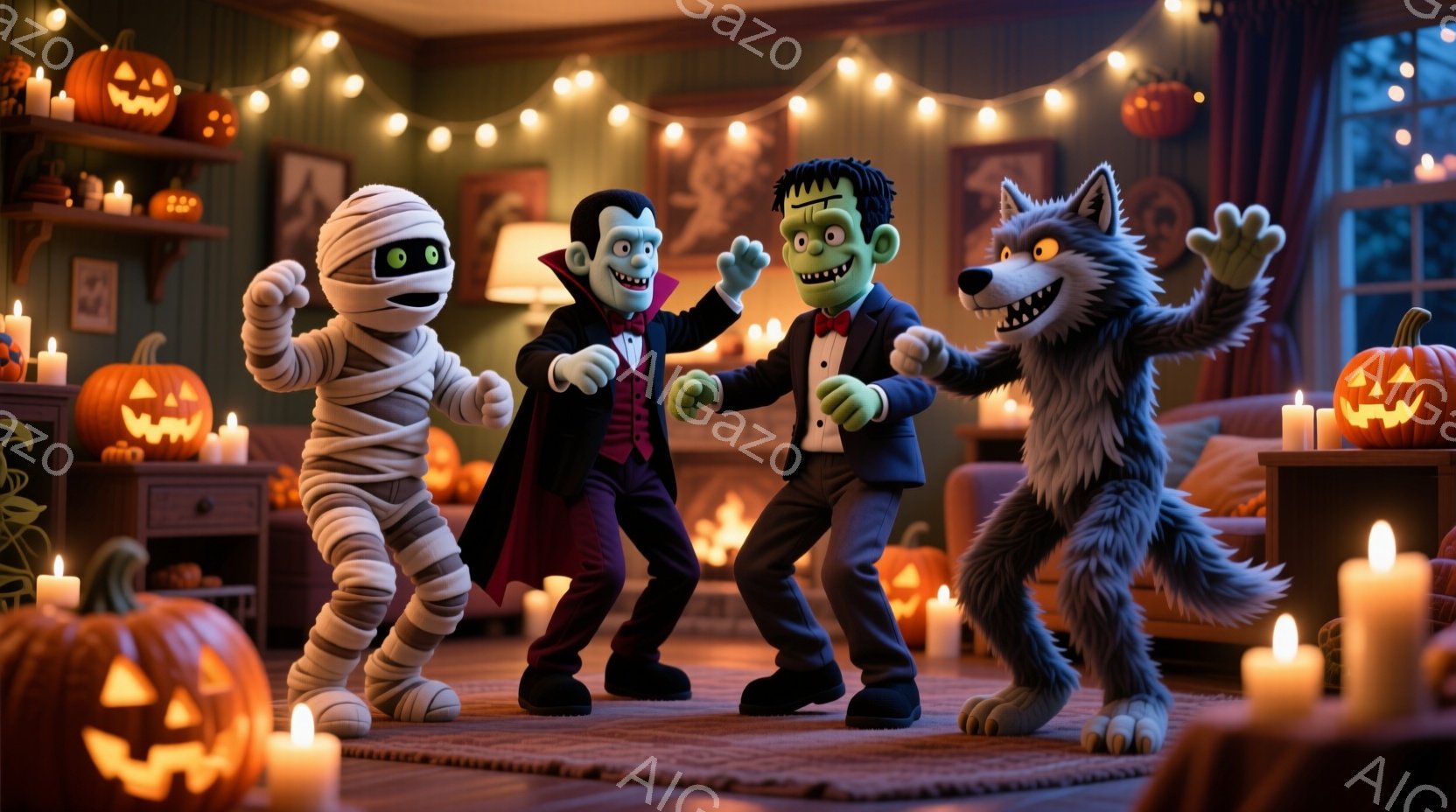 ハロウィーンの装飾が施された室内で、ミイラ、ドラキュラ、フランケンシュタイン、狼男の姿をしたキャラクターたちが踊っています。ミイラは包帯で全身を覆われ、ドラキュラは黒いスーツと赤いマントを身につけ、フランケンシュタインは緑色の肌とボルトの付いた首が特徴です。背景にはカボチャのランタンが置かれ、部屋全体が温かく、お祝いムードに満ちています。