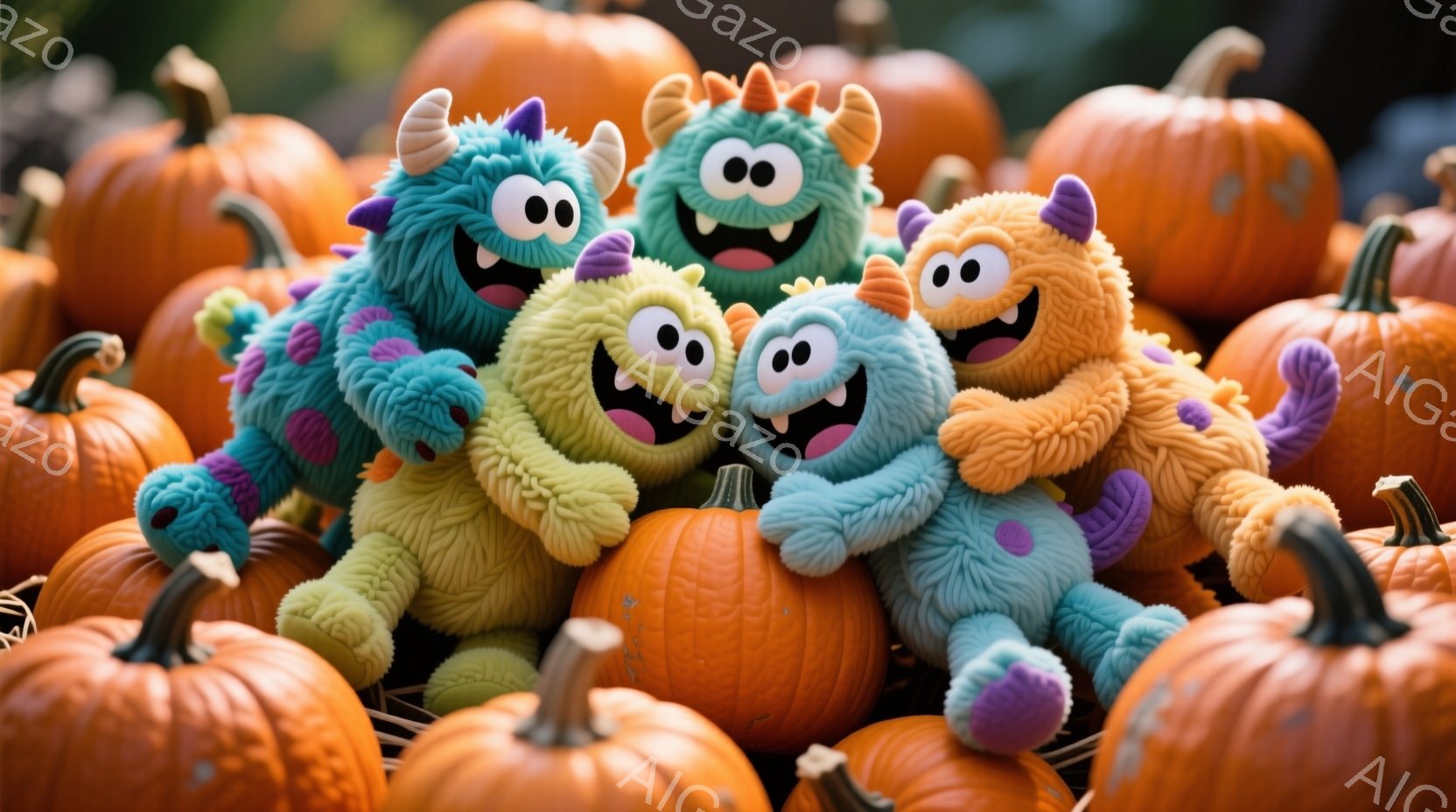 明るいオレンジ色のカボチャに囲まれた、青と黄色のモンスターのぬいぐるみたちが写っています。彼らは楽しそうに笑い、お互いに寄り添い、活気に満ちた陽気な雰囲気を作り出しています。背景には、さらに多くのカボチャが積み重なっており、ハロウィーンのようなお祭りのような雰囲気を感じさせます。