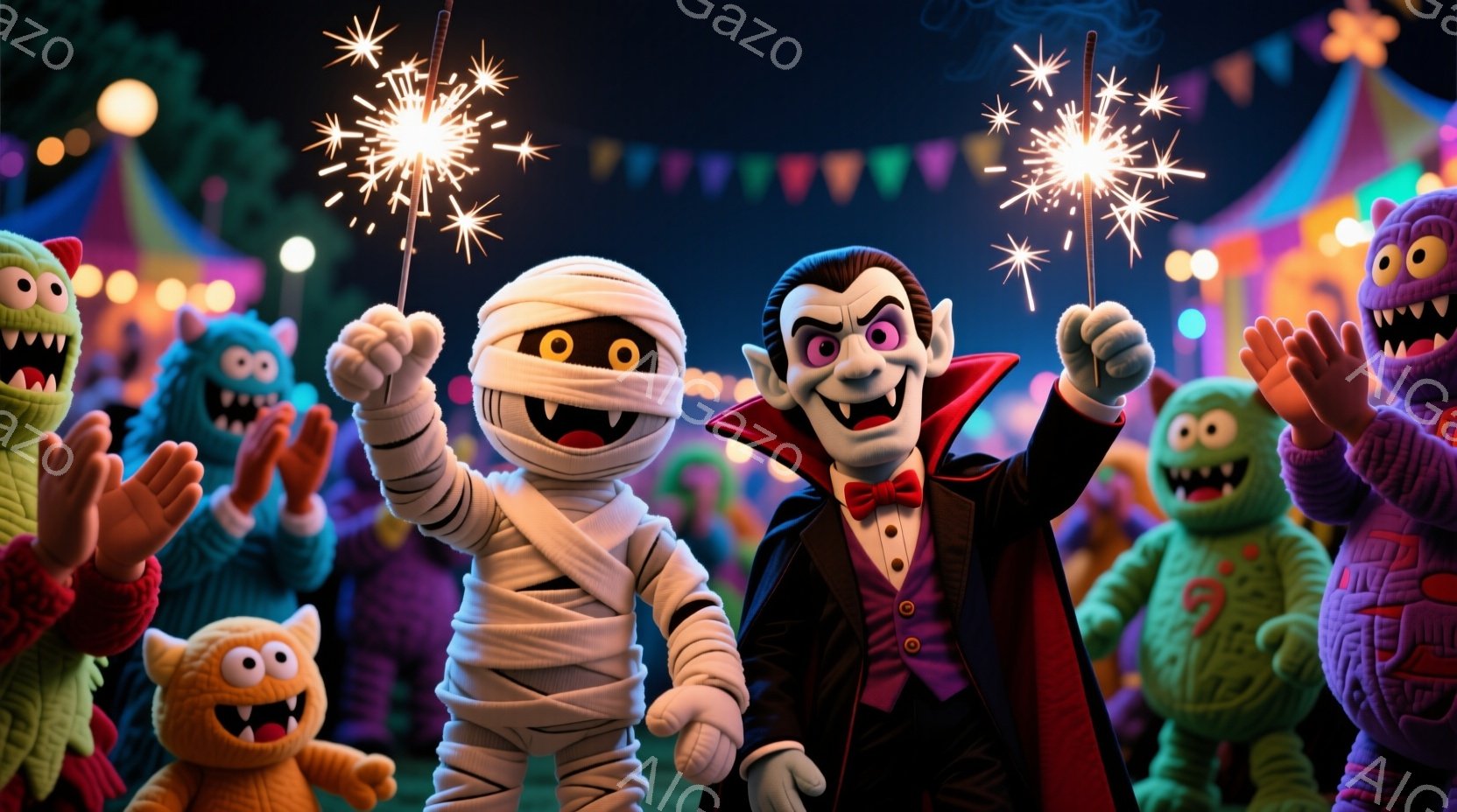 ハロウィーンを祝うモンスターたちが写っており、包帯でぐるぐる巻きになったミイラと、タキシードを着た吸血鬼が中心に立っています。背景には観客やカラフルな遊園地の装飾、夜空には花火が打ち上げられ、楽しげな雰囲気が漂っています。モンスターたちは皆笑顔で、お祭り気分を盛り上げています。