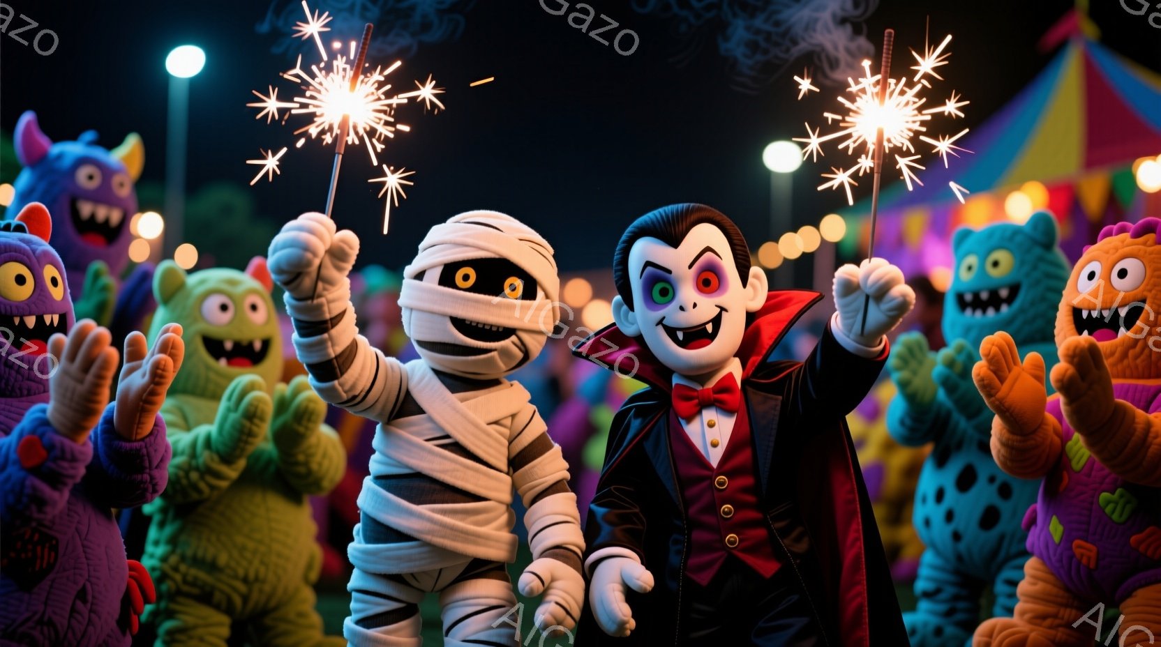 ハロウィーンの衣装を着た様々なモンスターたちが、夜の遊園地で花火を楽しんでいます。吸血鬼は黒い燕尾服と赤いマントを着て、片手に花火を持ってポーズをとっており、ミイラは包帯で全身を覆っています。背景には、明るい光に照らされた遊園地のアトラクションや建物があり、お祭り騒ぎの賑やかな雰囲気が漂っています。