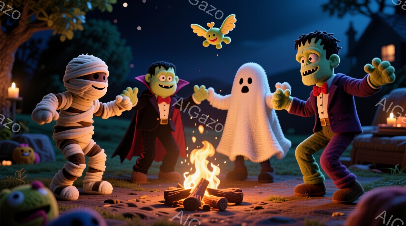 包帯でぐるぐる巻きになったミイラ、黒いスーツを着た吸血鬼、そして白い幽霊が、キャンプファイヤーを囲んで踊っています。ミイラは片足を高く上げて楽しそうに踊り、吸血鬼は片手を上げて微笑み、幽霊は左右に揺れています。背景には木々や家が見え、夜空には星が輝き、お祝いムードのハロウィンナイトを演出しています。