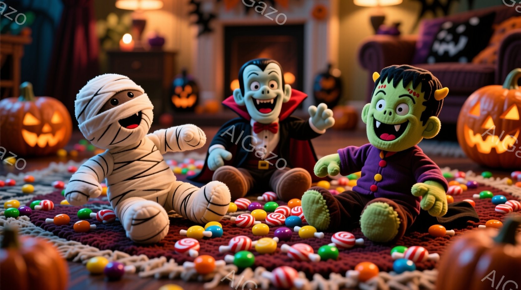 ハロウィーンの装飾がされた部屋で、ミイラ、ドラキュラ、フランケンシュタインのぬいぐるみたちがカラフルなキャンディーに囲まれて座っています。ミイラは包帯で全身が覆われ、ドラキュラは黒いスーツと赤いマントを身につけ、フランケンシュタインは緑色の肌とボルトの首を持っています。背景には、ハロウィーンの飾りやカボチャがあり、暖かくお祝いムードに満ちています。