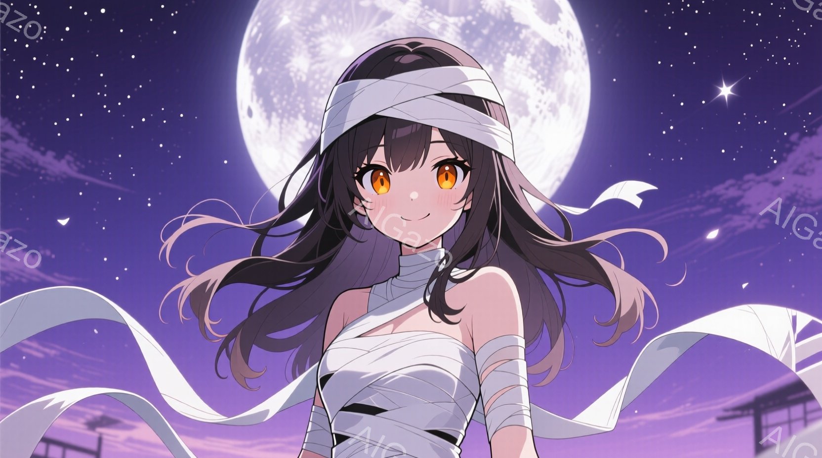 この無料AI生成画像「長い黒髪に白いヘッドバンドをつけた女性が描かれています。彼女は白い布で胸と腕を包み、どこか神秘的な雰囲気を醸し出しています。背景には紫と青のグラデーションの夜空と満月が広がり、彼女の表情は明るく、どこか憂いを帯びています。」は、2025年10月24日に作成されました。 サイズは 1664×928px の高解像度で、商用利用も可能なフリー素材として提供しています。