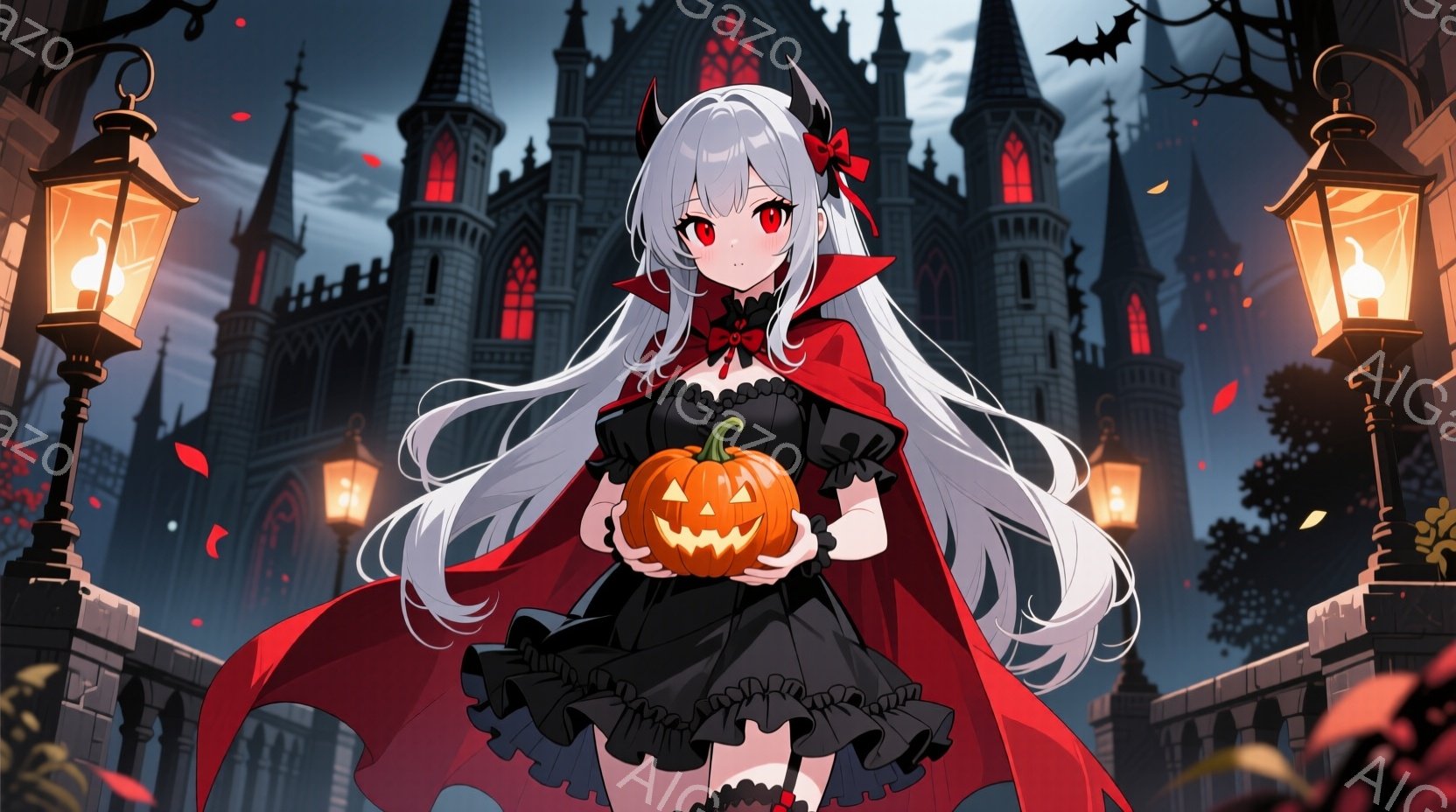 白髪の少女が、黒いフリルドレスと赤いケープを身につけ、オレンジ色のジャック・オ・ランタンを抱えています。彼女は少し微笑んでおり、どこか神秘的な表情をしています。背景には、ゴシック様式の城と、夜空に浮かぶ月が見え、ハロウィンの夜らしい幻想的な雰囲気を醸し出しています。