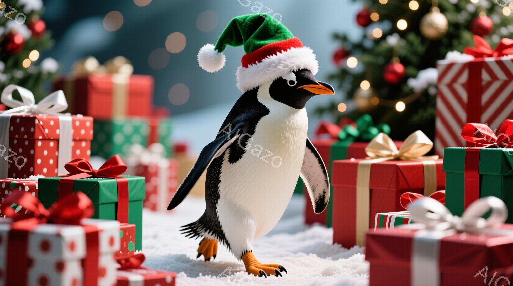 白と黒のペンギンが、赤いサンタ帽をかぶって雪の上に立っている。周りには様々な色や模様のプレゼント箱が積み重ねられており、背景にはぼやけたクリスマスツリーの光が見える。全体的に暖かく、お祝いムードにあふれた、クリスマスの雰囲気が漂う画像である。