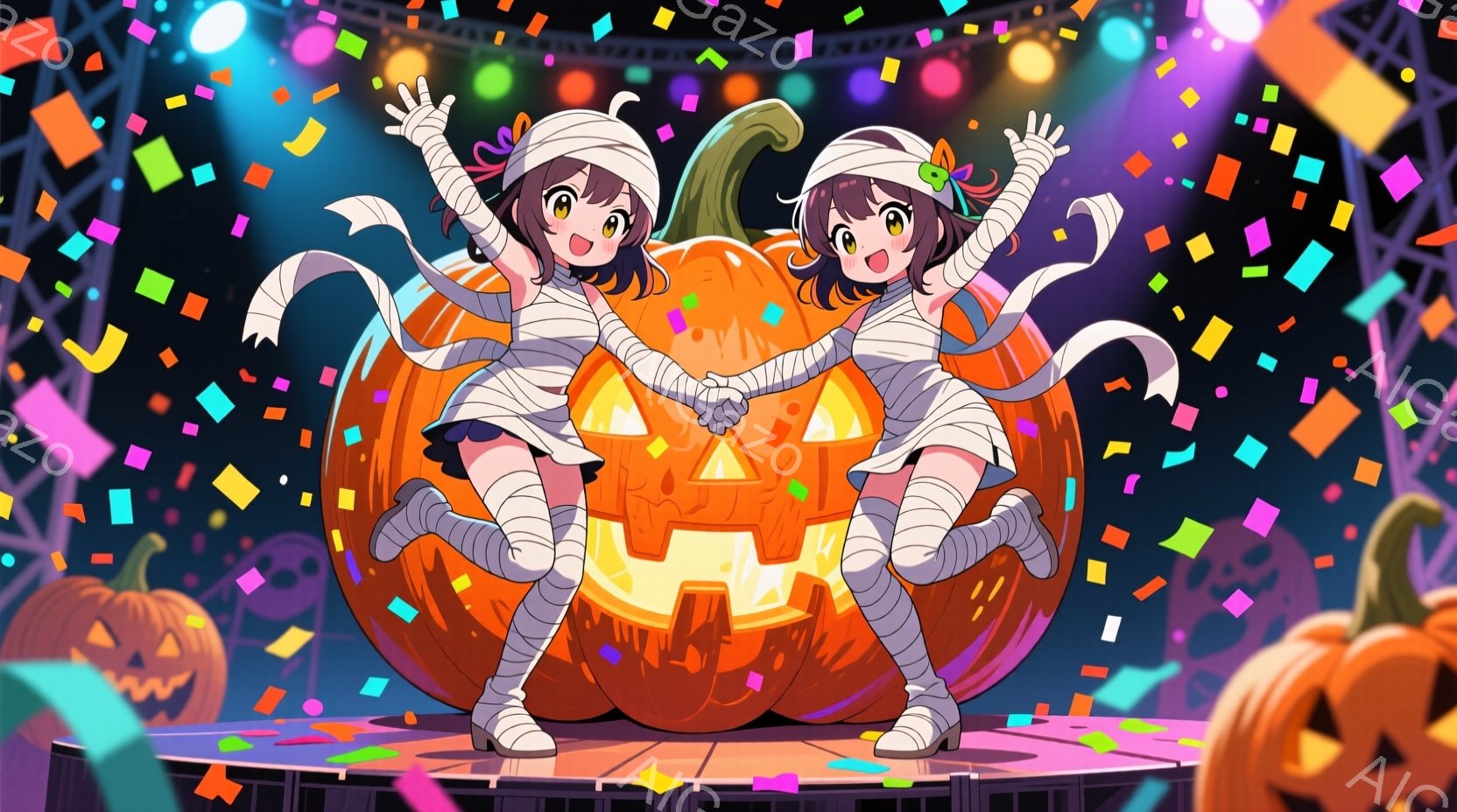 双子の少女がハロウィーンのミイラ風の衣装を着て、巨大なジャック・オ・ランタンの前で手をつないで踊っています。彼女たちは茶色の短い髪で、明るい笑顔を見せ、楽しそうにしています。背景には、他のハロウィーンの装飾とステージのような構造物があり、お祝いムードが高まっています。