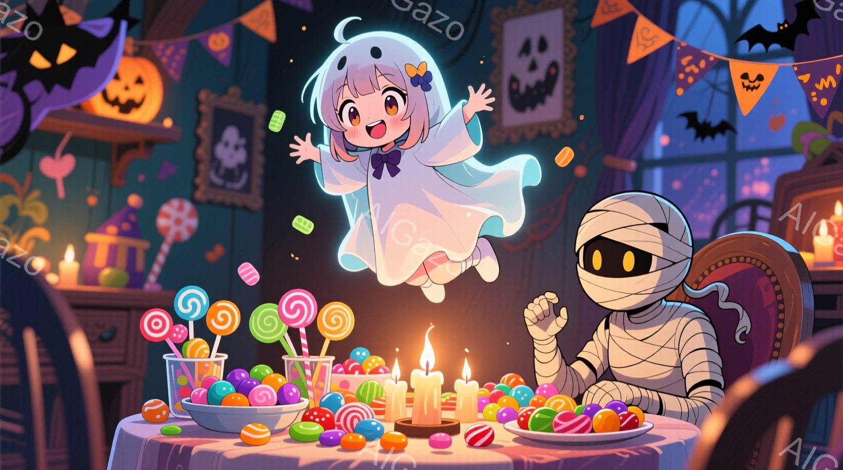 少女は白い幽霊の衣装を着ており、短い髪にはリボンが付いています。彼女は嬉しそうに空中に浮かんでおり、テーブルに並んだキャンディーを見ています。背景にはハロウィンの飾り付けが施された部屋が広がり、暖かく楽しい雰囲気が漂っています。