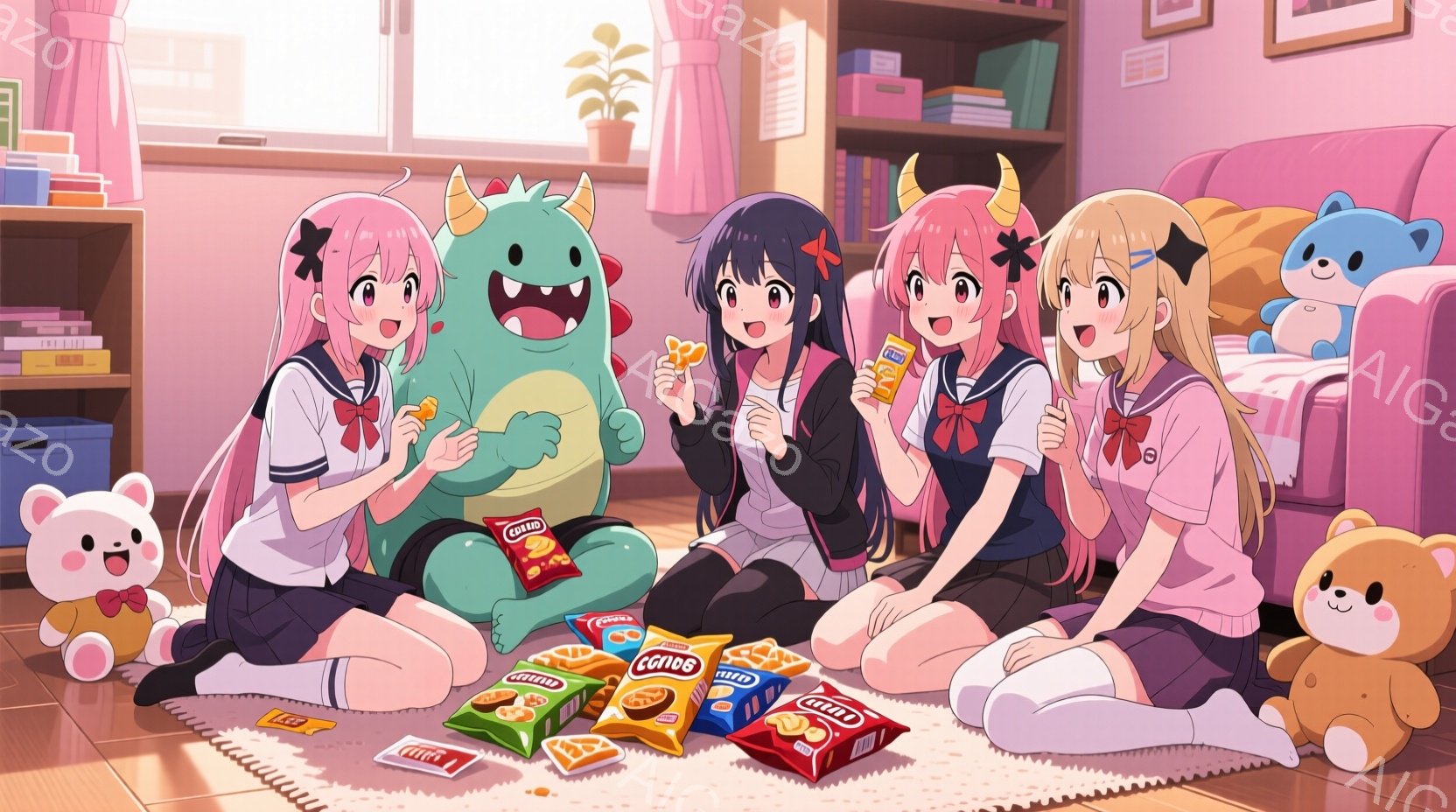 5人の少女たちが円になって座り、お菓子を広げて楽しんでいます。彼女たちはそれぞれ異なる髪色と服装で、制服のような衣装に、頭には角のような飾りをつけています。背景にはテレビやぬいぐるみ、暖炉があり、暖かい雰囲気の部屋の中でくつろいでいる様子が伺えます。