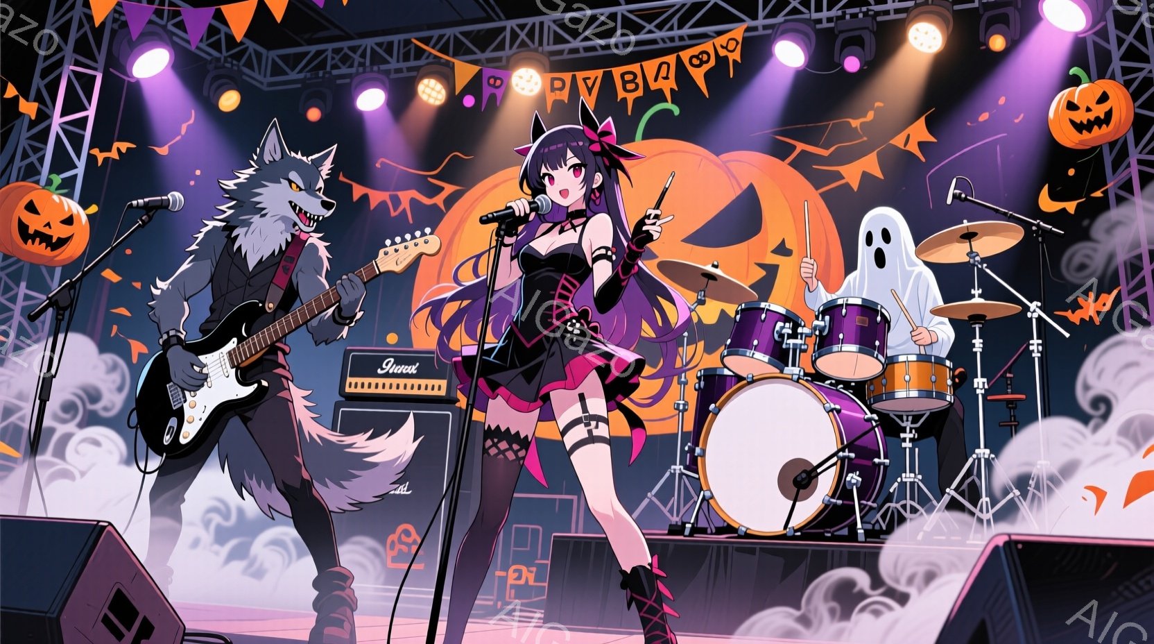 ハロウィーンの衣装を着た3人の少女が草原でジャンプしている様子が描かれています。左の少女は赤いドレスに黒いマントを羽織り、黒髪をツインテールにしています。中央の少女はミイラのような包帯で覆われ、右の少女は緑色の肌と黒髪で、魔女のような服装をしています。