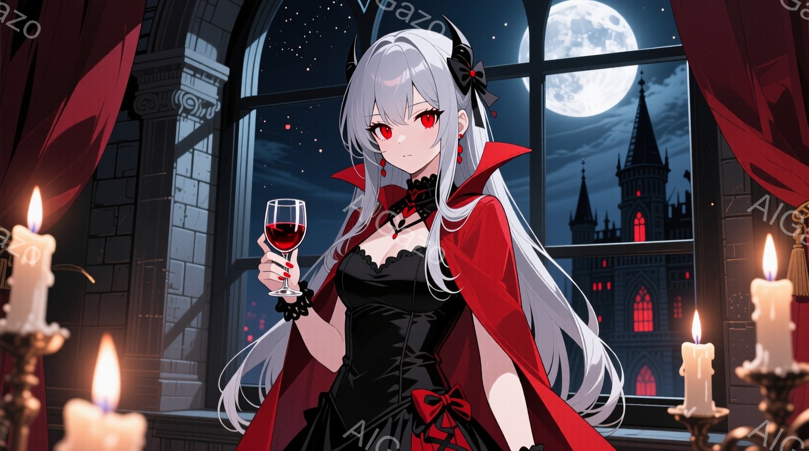 白髪の少女が、黒いドレスと赤いマントを身に着け、ワイングラスを手にしています。彼女は少し冷たい表情で、窓の外の夜景を見つめています。背景にはゴシック様式の建物と満月が輝き、周囲にはろうそくの光が灯り、神秘的で少し寂しげな雰囲気を醸し出しています。
