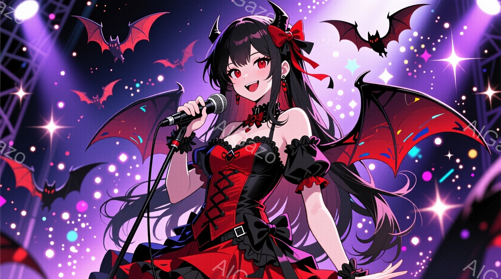 長い黒髪に赤いリボンをつけた少女が、黒と赤のコルセット風ドレスを着てマイクを持って歌っている。彼女は少し口を開け、楽しそうな表情で、片手を上げてポーズをとっている。背景には紫色の光と星、そしてコウモリが舞っており、コンサート会場のような華やかで幻想的な雰囲気を醸し出している。