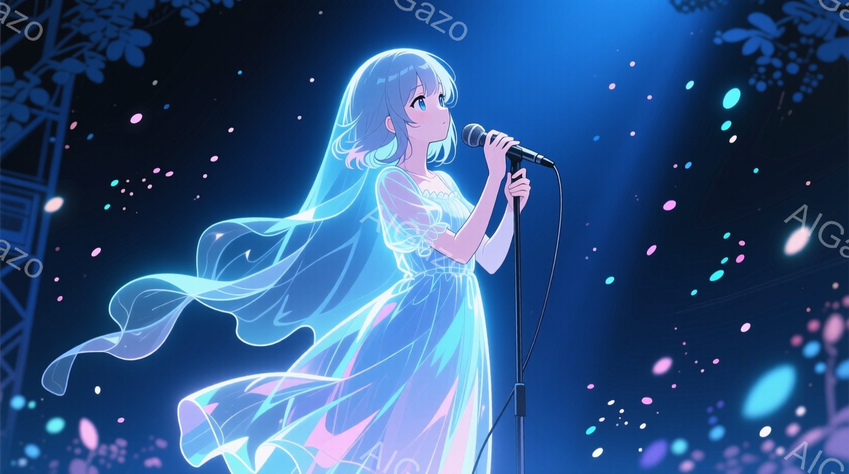 長い黒髪の女性が、淡い青と紫のグラデーションのかかったドレスとベールを身につけ、ステージで歌っている。彼女はマイクに向かって少し上目遣いで歌っており、表情は真剣で集中している。背景には、ぼやけた構造物と多数の光の粒子があり、幻想的で夢幻的な雰囲気を醸し出している。