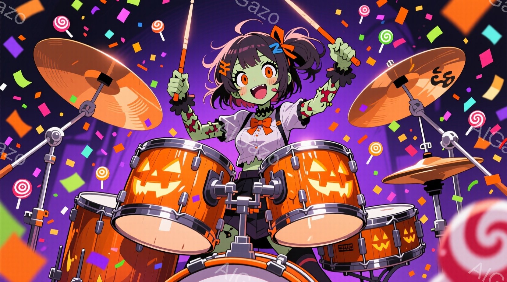 明るい緑色の肌をした少女が、ハロウィーンをテーマにしたドラムセットを演奏している。彼女は紫色の髪をポニーテールにし、オレンジ色のリボンで飾っており、笑顔で目を輝かせている。背景には、お菓子や紙吹雪が舞い、ドラムセット全体がハロウィーンのお祝いムードに包まれている。