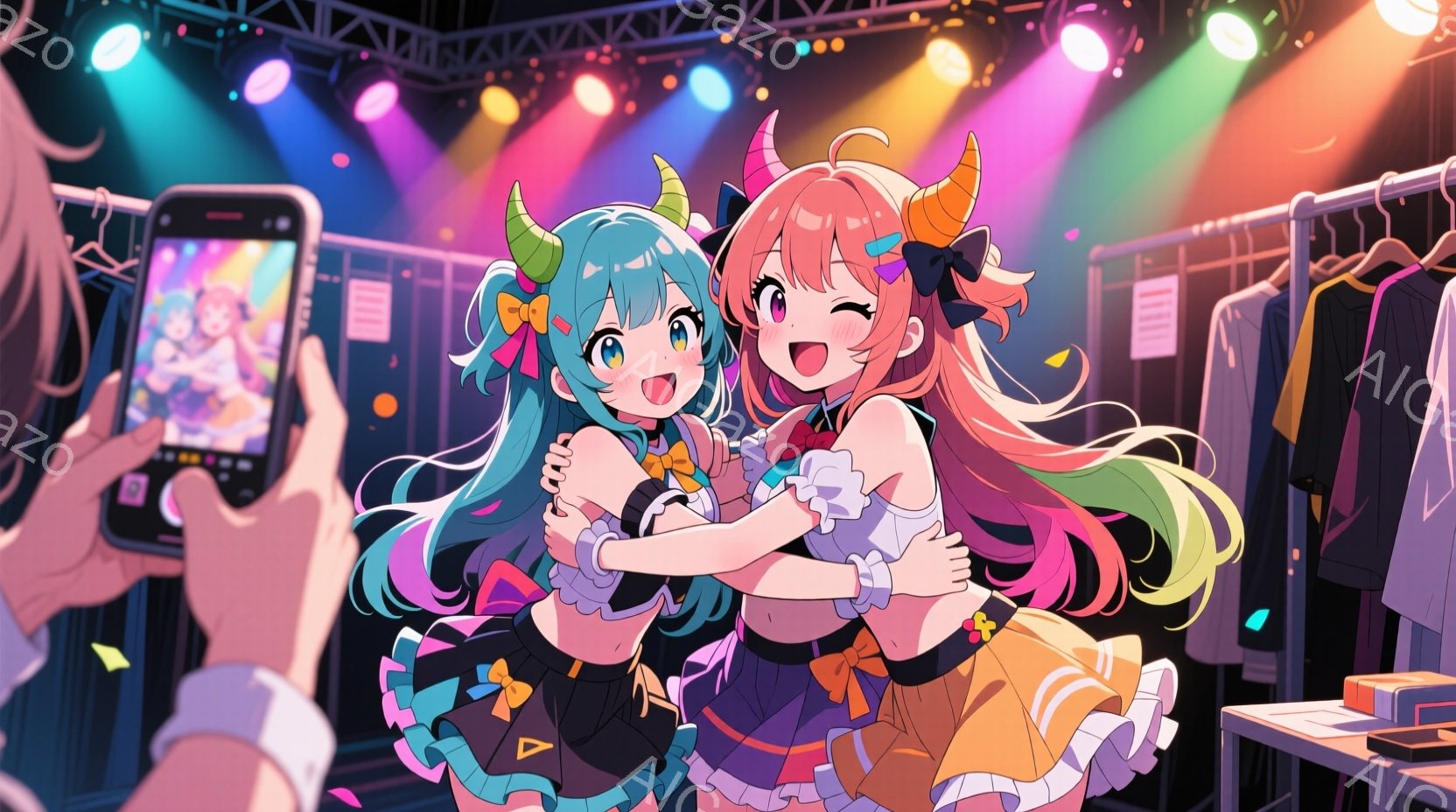 2人の若い女性が抱き合って笑顔でポーズをとっています。彼女たちはカラフルでファンシーな衣装を着ており、髪型も個性的で、片方は明るい金髪のツインテール、もう片方は黒髪と紫のグラデーションのロングヘアです。背景はステージのバックステージのようで、機材や衣装ラックが並び、照明が照らされています。