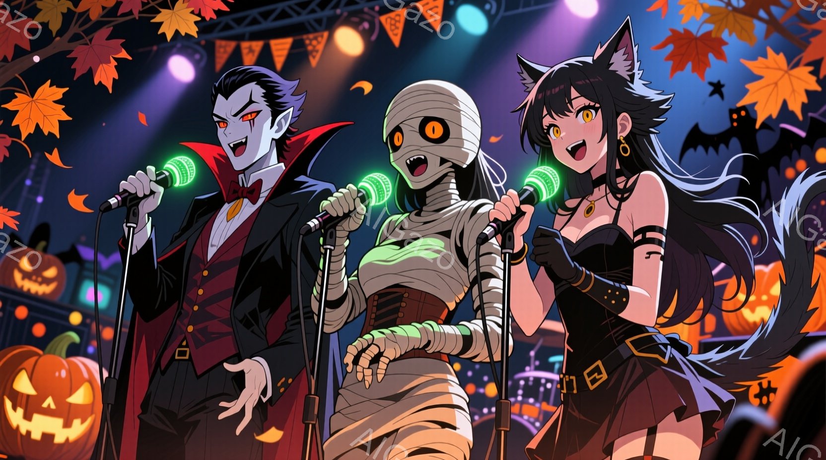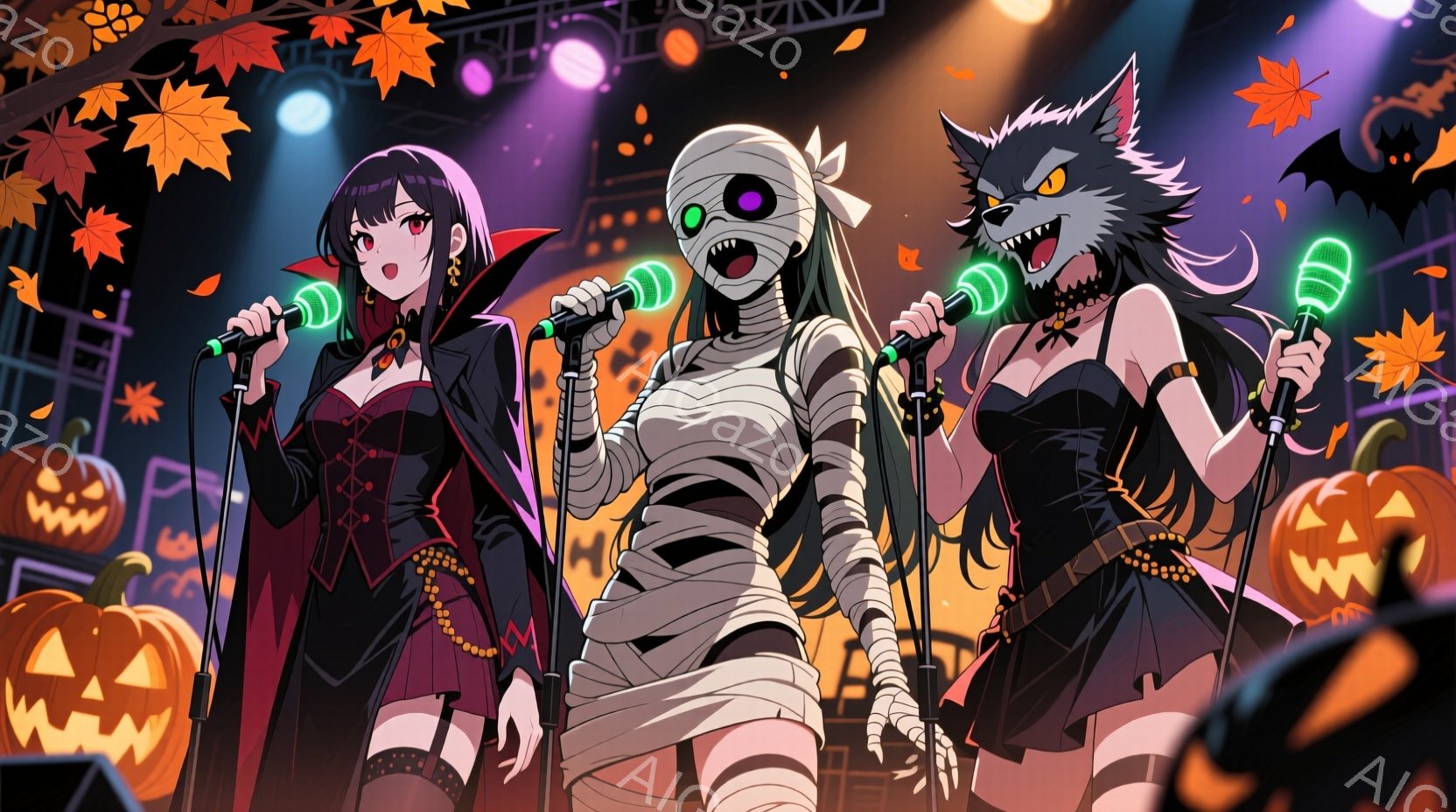ハロウィーンをテーマにしたイラストで、吸血鬼、ミイラ、狼女の3人がステージ上でマイクを持って歌っている様子が描かれています。吸血鬼は赤いドレスと黒いケープ、ミイラは全身を包帯で覆い、狼女はファー付きのジャケットと短いスカートを着用しており、それぞれ特徴的な衣装を着ています。背景には、カボチャのランタンや落ち葉が散りばめられ、ハロウィーンの雰囲気を盛り上げています。