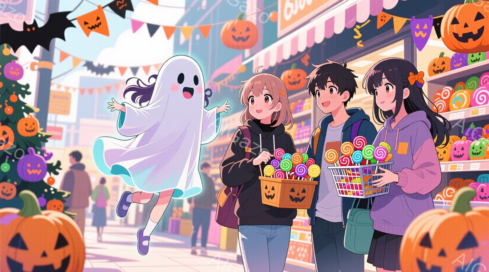 少女と少年がハロウィーンのキャンディーを選んでいる様子が描かれています。少女はオレンジ色の髪をツインテールにし、黄色のトップスとデニムのショートパンツを着ています。背景にはカボチャのランタンやカラフルなキャンディーが飾られ、ハロウィーンの楽しい雰囲気が漂っています。