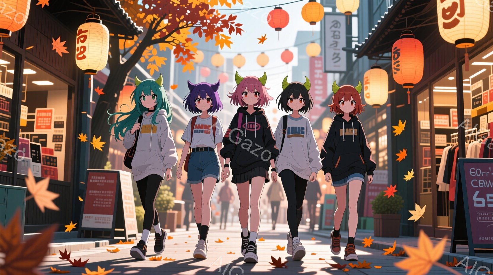 歩道を歩いている若い女性たちが描かれています。彼女たちはそれぞれ異なる髪色と服装をしており、カジュアルなスタイルで、白いスニーカーを履いています。背景には、日本の商店街のような建物が並び、赤と黄色の提灯が飾られ、地面には落ち葉が散らばり、秋の雰囲気を醸し出しています。