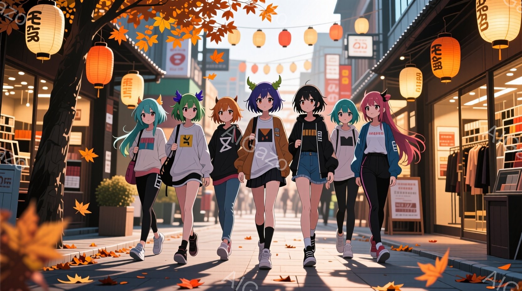 賑やかな商店街を歩く四人の少女が描かれています。それぞれが個性的な服装で、パーカーやショートパンツを着用し、前髪を下ろしたヘアスタイルに、少し挑戦的な表情を浮かべています。背景には日本の伝統的な建物と、紅葉の葉が舞い散る秋の風景が広がっており、活気のある暖かい雰囲気が感じられます。
