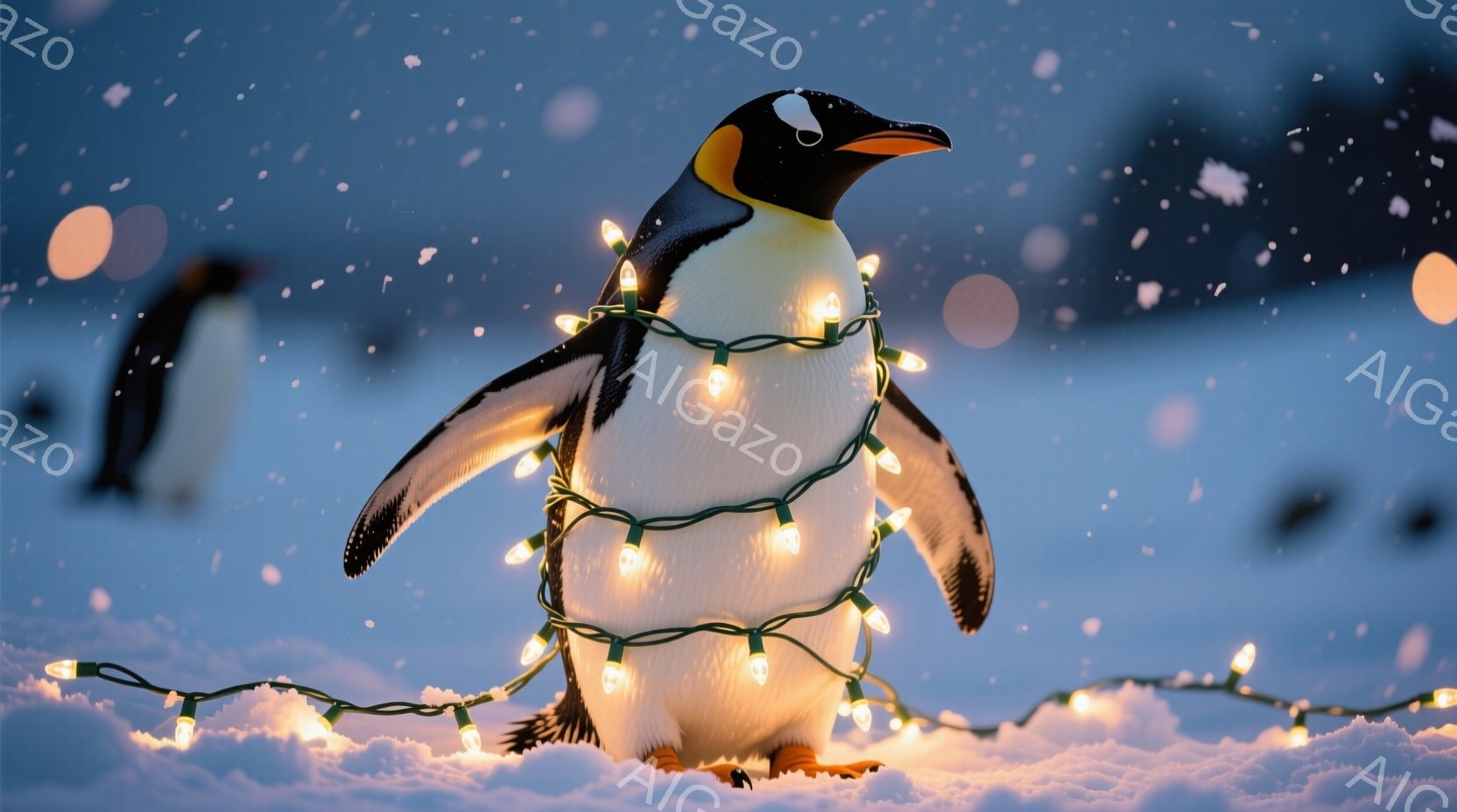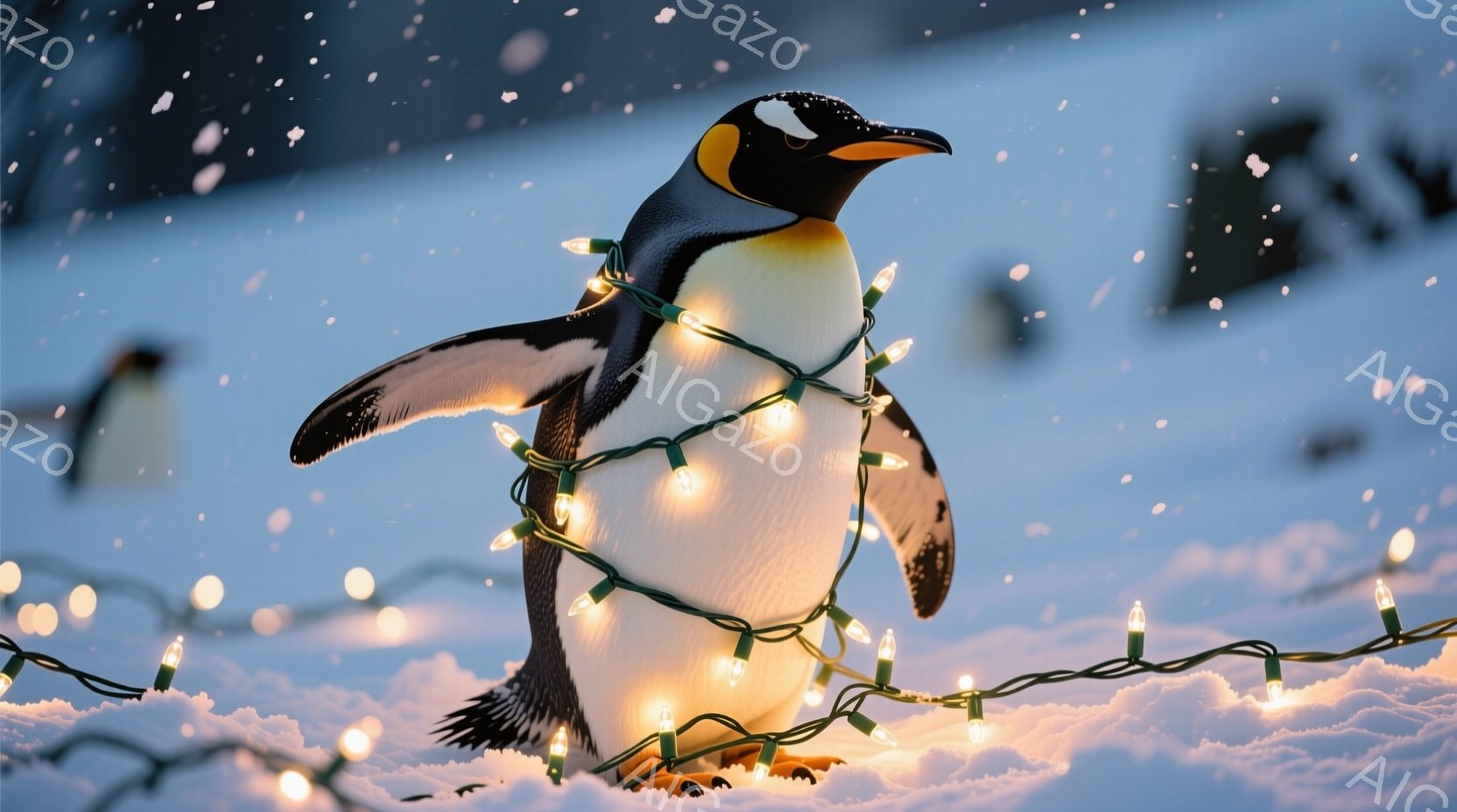 コウテイペンギンが雪の上に立っており、首と胴体にクリスマスライトが巻き付いています。ペンギンは前を向き、やや真剣な表情をしています。背景は雪景色で、ぼやけた光の粒子が舞い、冬の幻想的な雰囲気を醸し出しています。