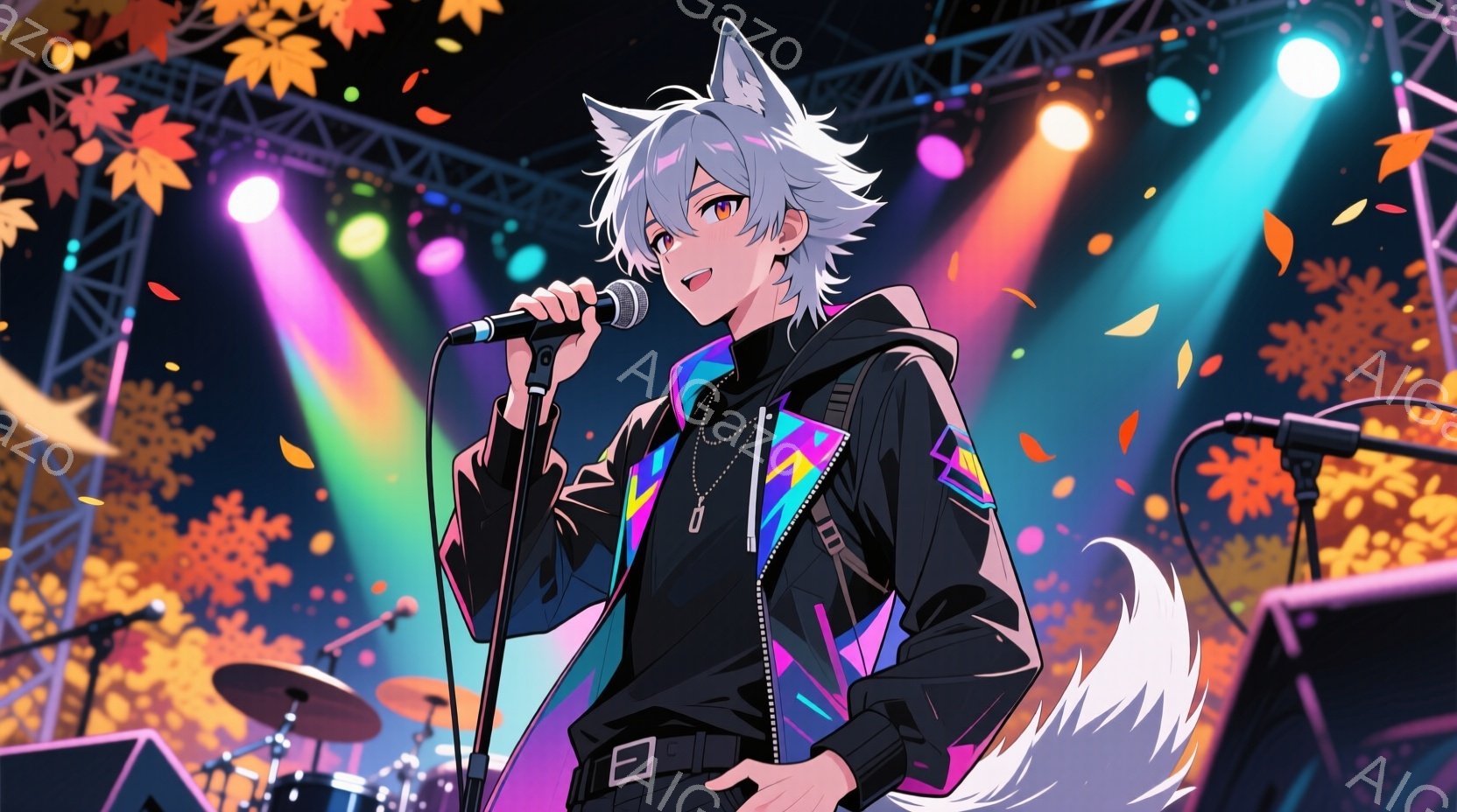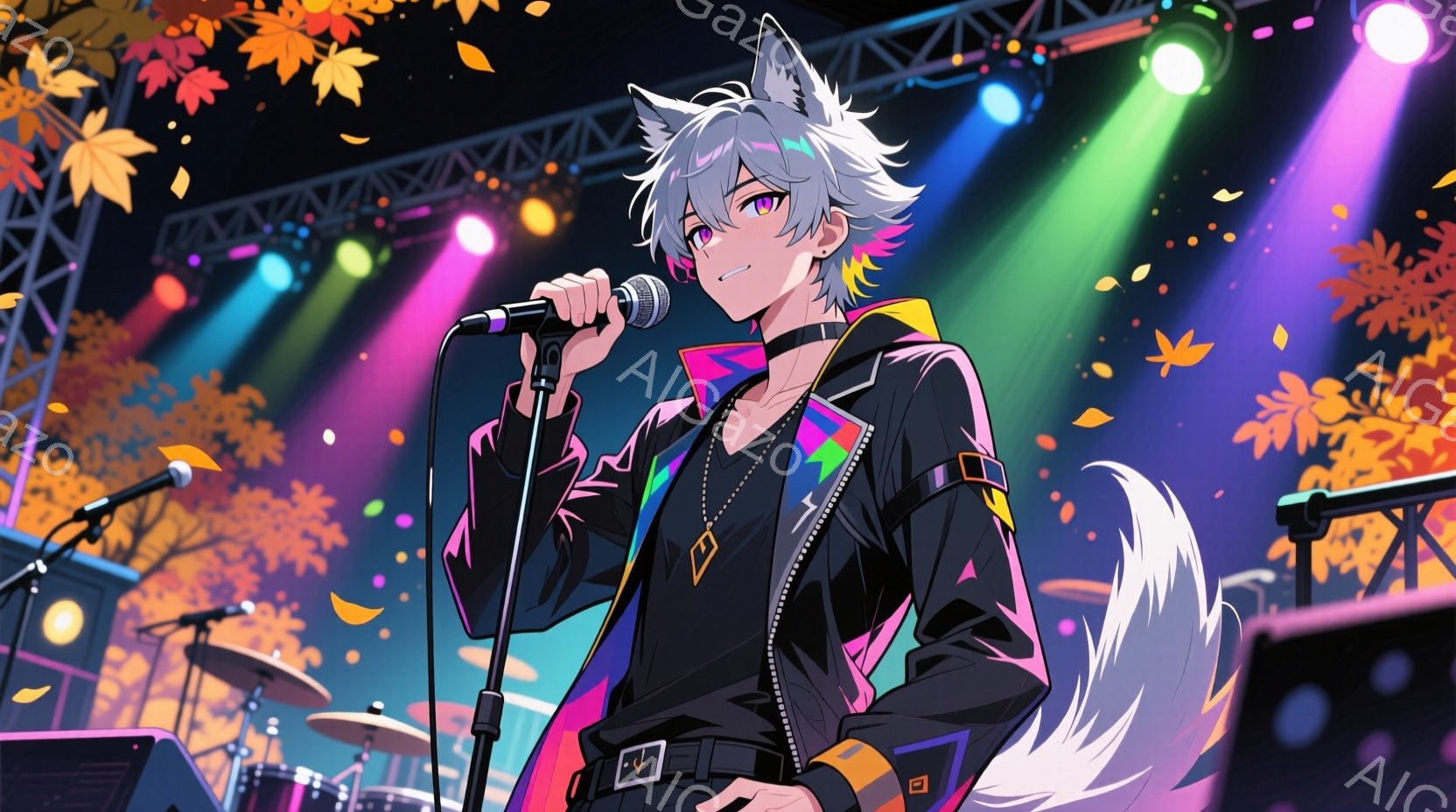 白髪でフォックスのような耳と尻尾を持つ若い男性が、ステージ上でマイクを手に歌っている。黒の革ジャン、紫色のインナー、黒いズボンを身につけ、片手をズボンのポケットに入れている。背景には、ステージ照明とドラムセット、そして舞い散る黄色の葉があり、コンサート会場の賑やかさと秋の雰囲気が伝わる。
