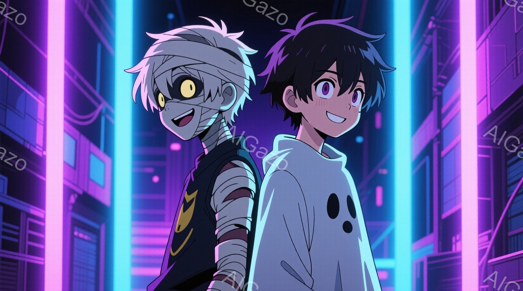 この無料AI生成画像「少年二人が並んで立っており、一人は包帯で顔と腕を覆っている。彼は白いジャケットに黄色い稲妻の模様があり、目は赤く、口を開けて微笑んでいる。もう一人の少年は黒髪で、青い光のエネルギーが彼の手から発しており、活気に満ちた表情でこちらを見ている。」は、2025年10月24日に作成されました。 サイズは 1664×928px の高解像度で、商用利用も可能なフリー素材として提供しています。