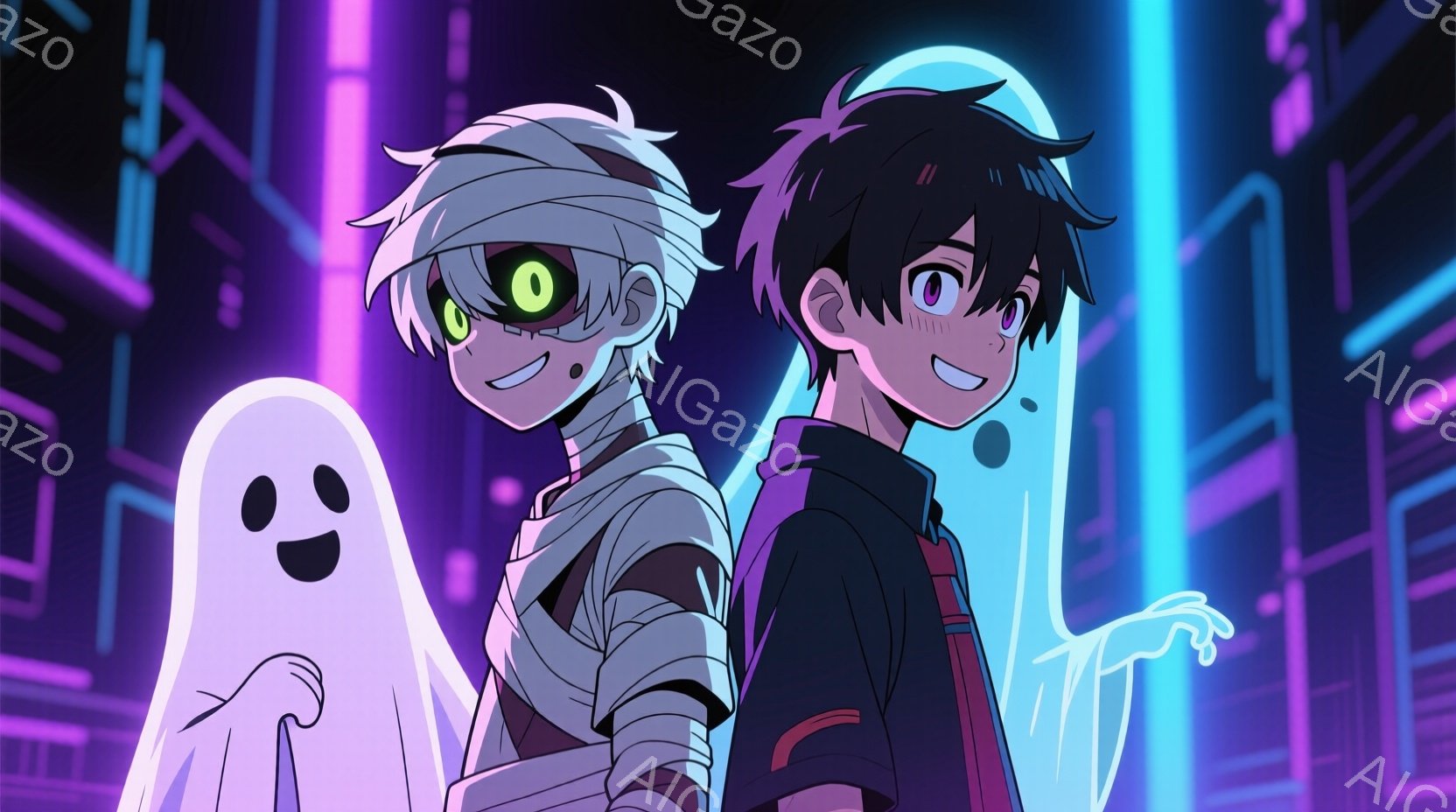 この無料AI生成画像「少年二人が並んで立っており、一人はミイラの包帯で頭を覆っている。もう一人は白い幽霊のような衣装をまとっており、背中合わせになっている。背景にはネオンライトが輝く都市の風景が広がり、全体的に幻想的で少し不気味な雰囲気である。」は、2025年10月24日に作成されました。 サイズは 1664×928px の高解像度で、商用利用も可能なフリー素材として提供しています。