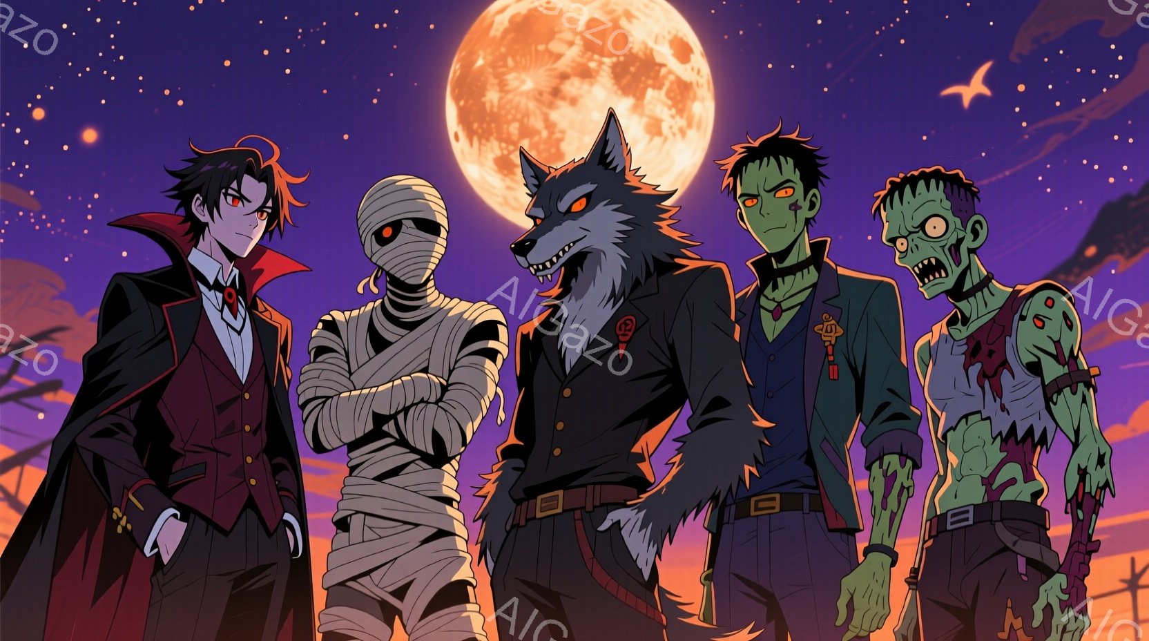 画面には、ヴァンパイア、ミイラ、狼男、ゾンビの4人のキャラクターが並んでいます。彼らはそれぞれ異なる服装をしており、ヴァンパイアは黒いスーツに赤いネクタイ、ミイラは包帯で全身が覆われ、狼男はスーツに毛皮の要素があり、ゾンビはボロボロの服を着ています。背景には、オレンジと紫が混ざった夜空、満月、そして遠くに見える街並みが描かれ、ハロウィーンのような不気味な雰囲気を醸し出しています。