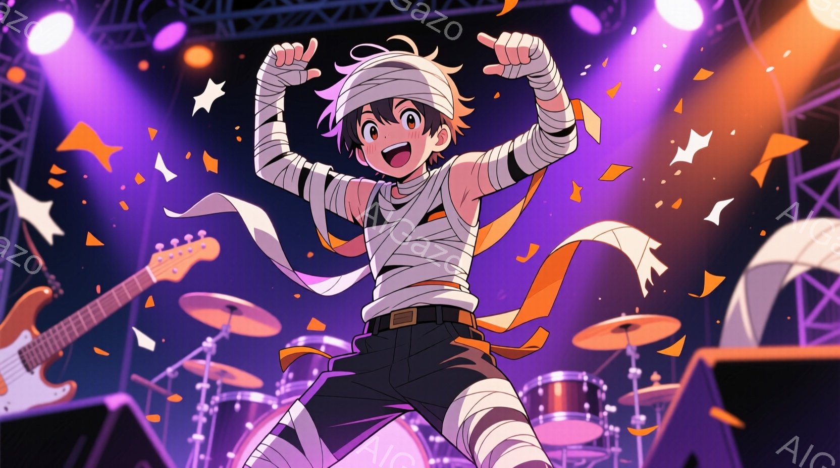 若い男性がドラムセットの前で演奏しているイラストです。彼は腕と頭に包帯を巻き、黒いズボンと白いシャツを着ており、興奮した表情で片手を上げています。背景にはスピーカーや照明があり、オレンジ色の紙吹雪が舞い、ライブ会場のような活気に満ちた雰囲気を演出しています。