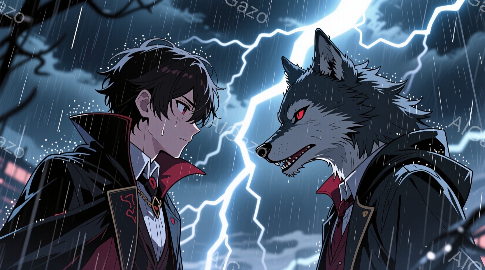 黒髪の男性は、赤い襟と金色のボタンが付いた黒いコートを着ており、やや不機嫌そうな表情をしています。彼の隣には、牙をむき出し、赤い目をした大きな黒い狼がおり、互いに睨み合っています。背景は激しい雨と稲妻が光る嵐の夜で、遠くにぼんやりとした建物のシルエットが見えます。