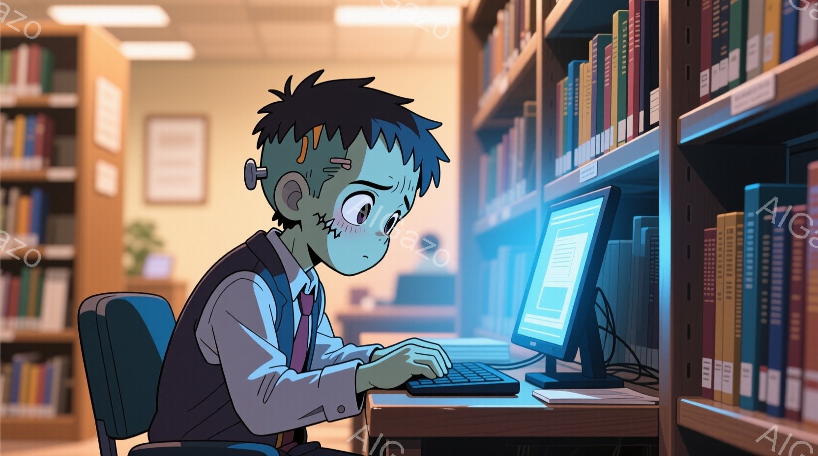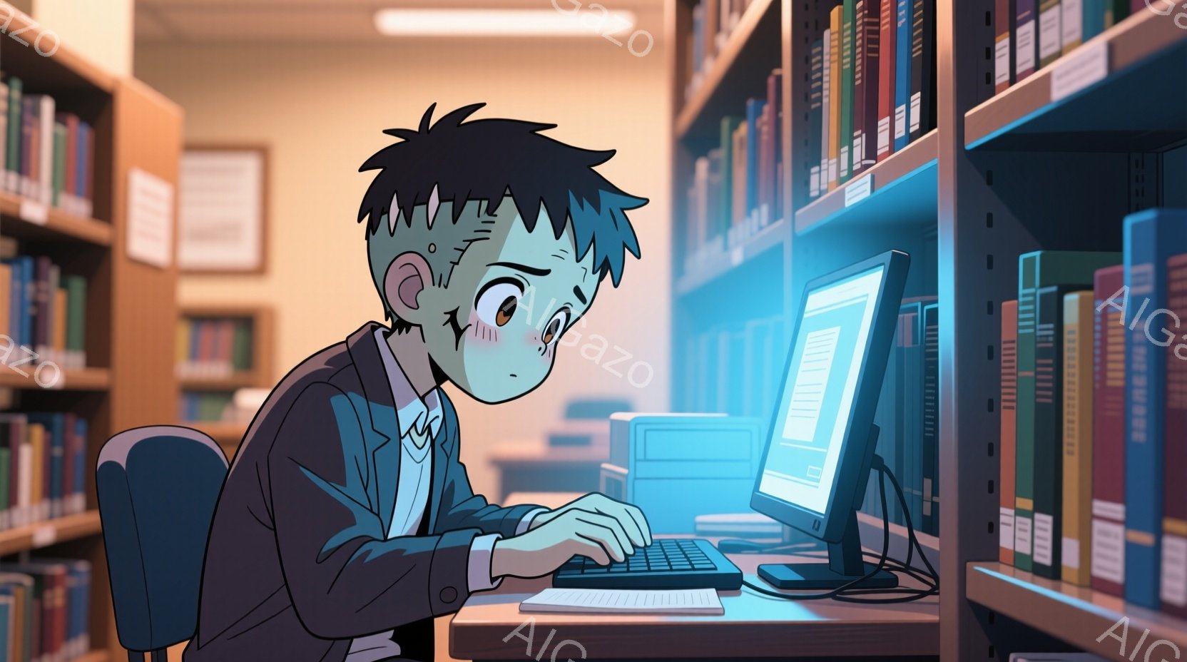 図書館でパソコンに向かう緑色の肌をした少年が描かれています。彼は紺色のジャケットと白いシャツを着ており、疲れた表情で目の下にクマがあり、頬は赤くなっています。背景には本棚が並び、他の利用者がぼんやりと見え、集中して作業している雰囲気です。