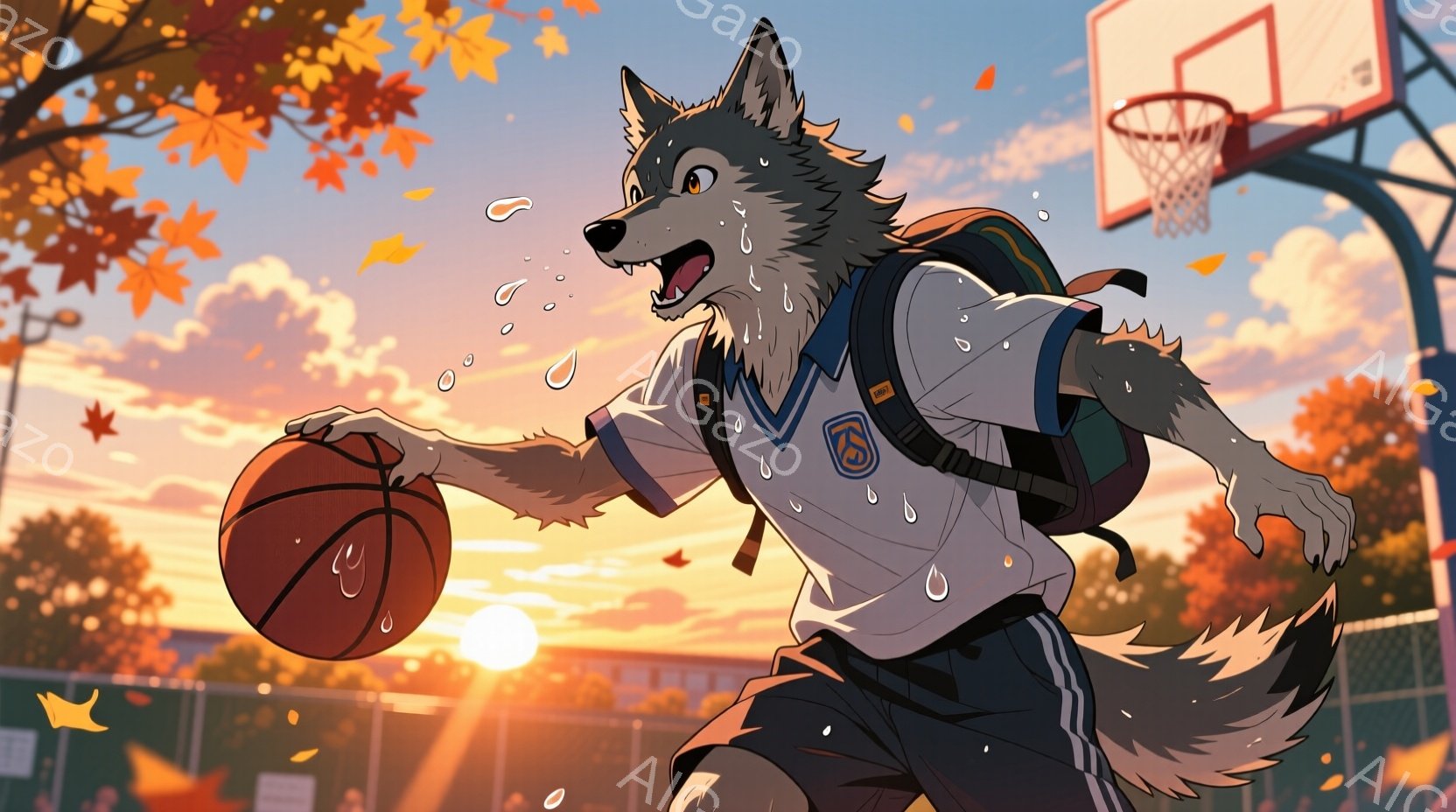 オオカミをモチーフにしたキャラクターが、バスケットボールを抱え、コートを歩いている様子が描かれています。制服のような白いシャツに青いズボンを着用し、肩にはリュックサックを背負っています。背景は夕焼け空とバスケットゴール、そして遠くに見える建物と自然で、秋の落ち葉が舞い散る様子から、どこかノスタルジックで青春を感じさせる雰囲気です。
