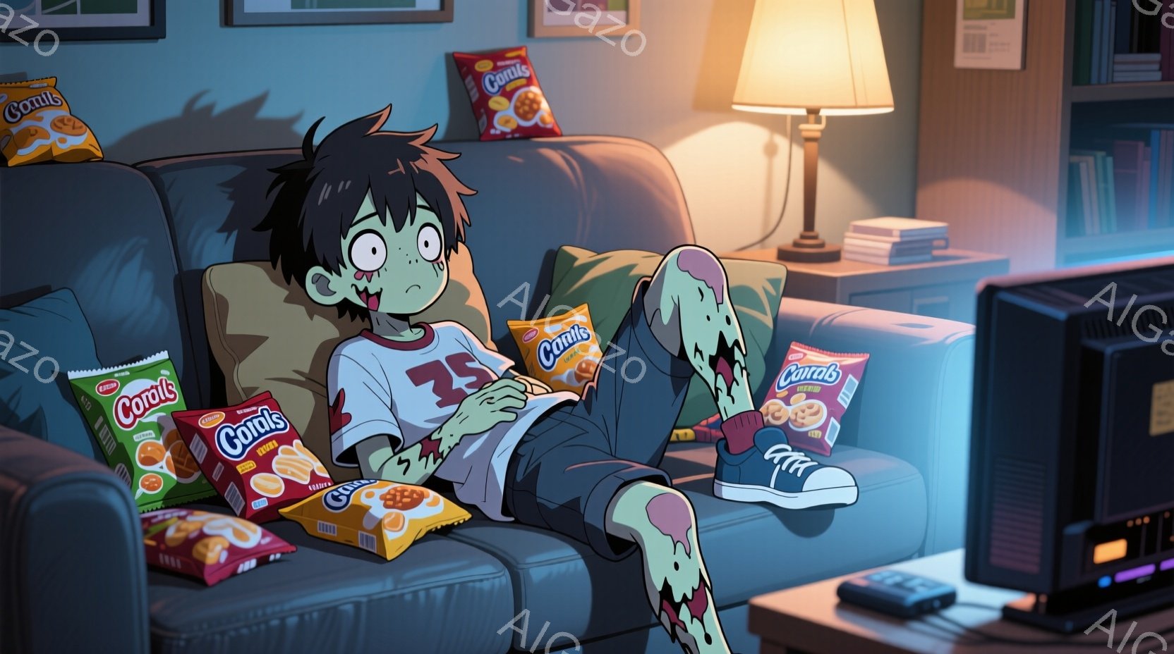 ソファに横たわる少年は、緑色の肌と爪、そして暗いクマのような目の下に、ゾンビのような外見をしている。彼は白いTシャツとパジャマのズボンを着用し、片手にドリトスのスナック菓子をいくつか持っている。背景には、テレビ、本棚、そして暗いリビングルームがあり、リラックスした、少し不気味な雰囲気が漂っている。