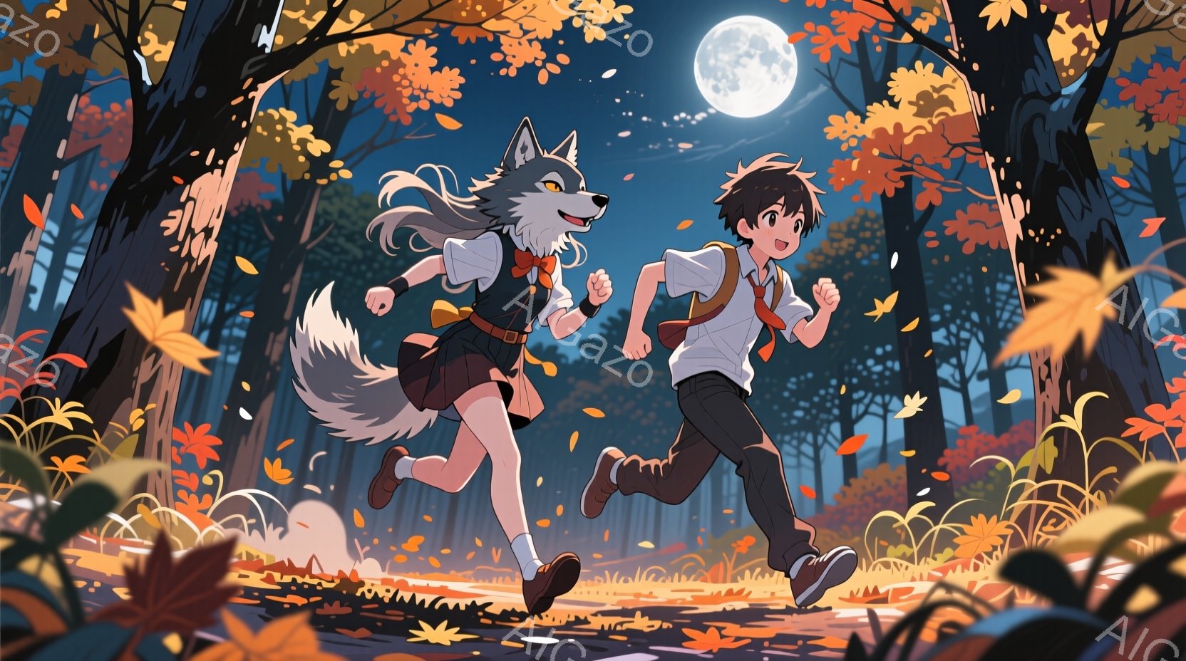 少年と狼少女が、紅葉の森の中を駆け抜けている。少年は黒い髪で、紺色のジャケットと黒いズボンを着用し、狼少女は白い髪と尻尾を持ち、赤いリボンと茶色のスカート、ブーツを履いている。背景には色鮮やかな紅葉の木々と満月が輝き、秋の夜の幻想的で躍動感あふれる雰囲気を醸し出している。