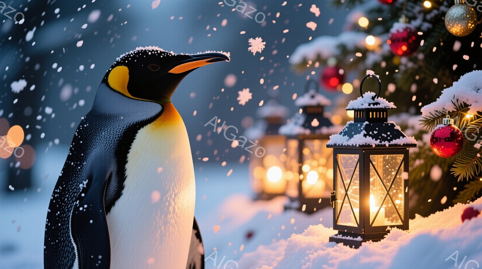 皇帝ペンギンが雪景色の中に立っており、背景にはキラキラと光るクリスマスツリーとキャンドルで灯されたランタンが並んでいます。雪が舞い降り、暖かく幻想的な雰囲気を醸し出しています。ペンギンの表情は穏やかで、まるで冬の祭りを静かに見守っているかのようです。