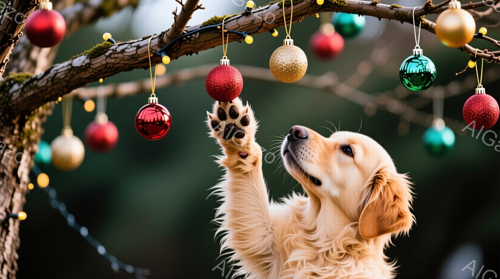 雪景色の中に、飾り付けられたクリスマスツリーとゴールデンレトリバーが立っている。犬は正面を見て少し口を開け、嬉しそうな表情をしている。背景には雪に覆われた木々が広がり、暖かく幻想的な冬の雰囲気を醸し出している。